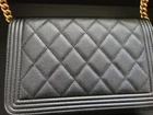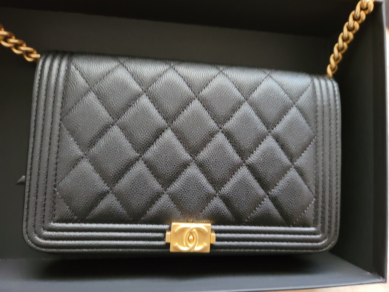 This CHANEL Boy Wallet On Chain WOC in black is a must-have for any fashion-forward woman. Crafted from high-quality caviar leather with a quilted finish, it features a snap closure and gold tone hardware. The bag measures 7.50 inches in width, 4.75 inches in height, and 1.50 inches in depth, making it the perfect size for everyday use. Features a strap drop of 25 inches. This bag is part of the CHANEL Boy product line. It is a gently loved item and is perfect for those who appreciate classic styles.