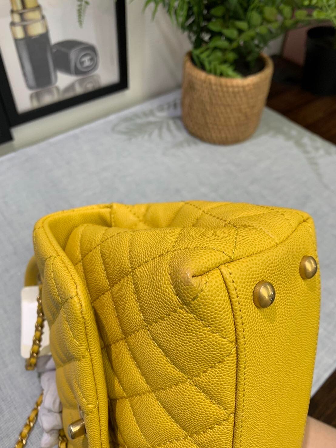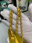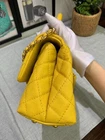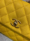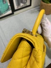 Elevate your style with this chic CHANEL Coco Handle bag, perfect for the fashion-forward woman. Crafted from luxurious caviar skin in a soft yellow hue, this top handle bag is both elegant and versatile. The bag features a yellow leather lining and a spacious interior to accommodate all your essentials. This mini CHANEL bag is a must-have for any designer bag collection. It is perfect for any occasion, be it a casual day out or a formal evening event. The bag's top handle design and leather straps make it easy to carry and comfortable to hold. Add a touch of sophistication to your wardrobe with this CHANEL Coco Handle bag.