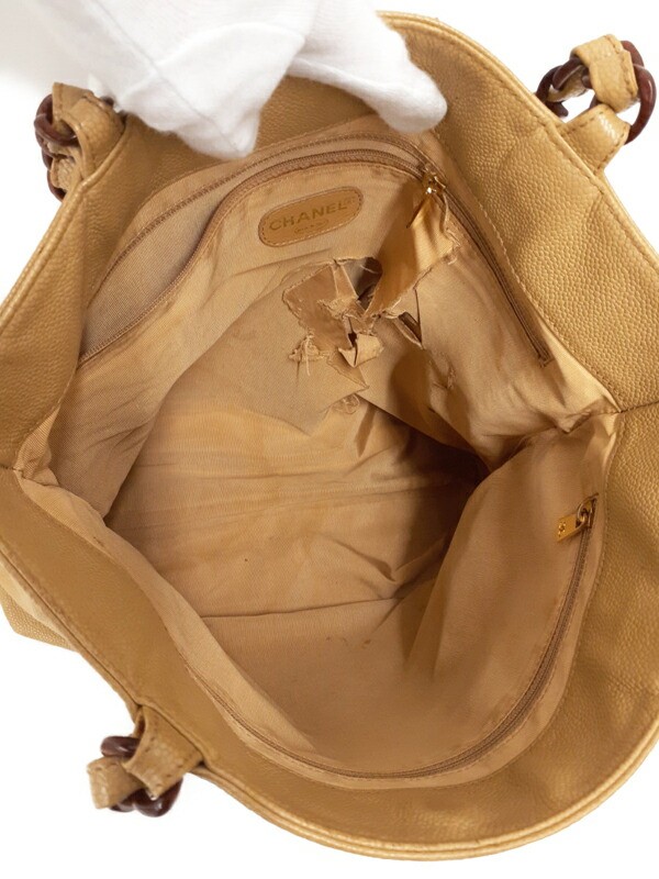 Thank you for coming my store ! Description - Chanel Coco Mark Wood-Pattern Plastic Chain Tote Bag - Women's beige tote bag made from grained calfskin - Dimensions: approx. 34.5cm (W) x 36cm (H) x 11cm (D), handle length about 53cm - Features 2 interior pockets, no guarantee, with manufacturing number sticker (5-digit) - Used condition with significant wear: surface scratches, stains, and discoloration on exterior; large tears, stains, and peeling inside; some metal plating peeling; odor present - Overall deterioration may worsen with use or storage - No accessories included Please note: Our size measurements are listed in centimeters. If you would like to know the size in inches, please multiply the centimeter value by 0.393. Even if it is shown in the photo, it may not come with a storage bag, card, paper bag, etc. when not stated. Please ask about the availability of accessories prior to purchase. All my products are 100% Authentic. Please be assured that we only sell items that have been appraised by specialists, mainly reuse stores and pawnshops. Please see photos for item condition. Please feel free to contact us if you have any question. We pack carefully. Payment Various payment options will show during checkout. Shipping (Expedited international shipping) I use DHL or FedEx or Japan Post. It takes around 3-7 days. International Buyers - Please Note: Import duties, taxes, and charges are not included in the item price or shipping cost. These charges are the buyer's responsibility. Please check with your country's customs office to determine what these additional costs will be prior to bidding or buying.