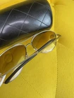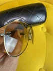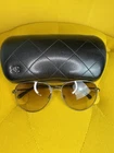The CHANEL Gold Titanium CC Aviator Sunglasses are a luxurious and stylish accessory for women. Made in Italy, these sunglasses feature a high-quality titanium frame in a sleek gold color, with the iconic CHANEL CC logo detail. The brown lenses add a touch of sophistication to the classic aviator style, making these sunglasses a must-have for any fashion-forward woman looking to make a statement sunglasses in good condition no scratches box included.