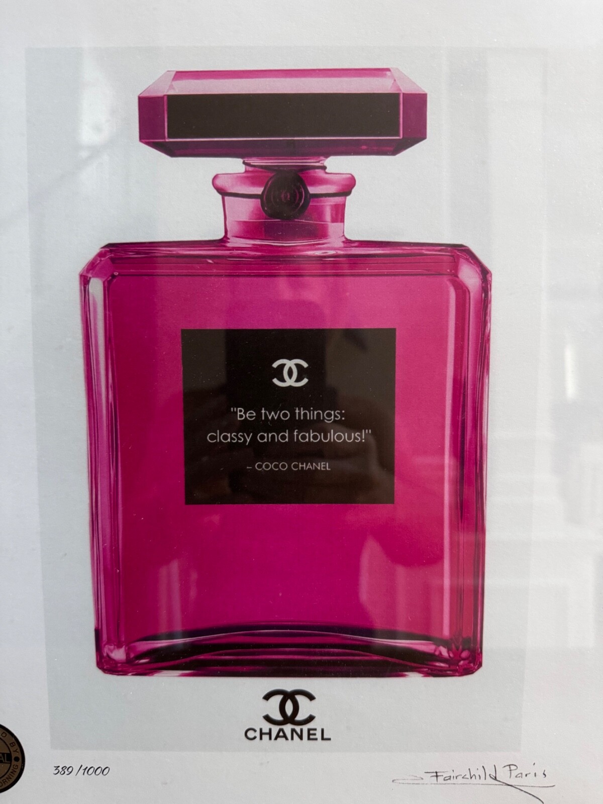 CHANEL PERFUME ART PRINT SIGNED FAIRCHILD PARIS #389/1000 LE COCO QUOTE 18X18" SUPER FUN PRINT! PREVIOUSLY OWNED AND GENTLY DISPLAYED - ESTATE SALE FIND NO DAMAGE BUT A TEAR IN DUST PAPER /BACK COVER THANK YOU FOR LOOKING Disclaimers All items are from local estate sales and garage sales around San Diego, Ca. All items sold by us are being described to the best of our ability and with utmost conscientiousness on our part, but please know we are not experts. To avoid any potential oversights, we respectfully request your assistance in thoroughly reviewing the description, photos and asking questions prior to Buying/Bidding. Any damage will be mentioned and included in photographs. Shipping Item(s) will be shipped within 1 business day (Monday-Friday) after payment has cleared. Depending on the fragility of the item, combined shipping may not be available on all items . Please message me to discuss shipping options. Return Policy 100% Satisfaction Guaranteed. We want to ensure that you are completely satisfied with your purchase. If not, then please let us know by messaging us on eBay before leaving any feedback & allow us to work with you to completely resolve any issues that you might be facing with your order. If you feel that you got an item that is different from what you ordered or if it arrived damaged or if you have any problems with the item, please email us & we will be glad to work with you in resolving any issues. All returns must reach us within 30 days after the item was delivered to you. The items must be in their original condition when they were sent to you. We will issue you a refund within 3 business days once the item has been received. Note: Depending on the reason for return, the original cost of shipping may not be included in refund amount.