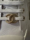 CHANEL Ladies Sneaker~ I paid $1300 “BRAND NEW IN BOX” New Style Sold Out!! 2025 size 11 they say 41.5. White, Lambskin “thin and soft” Sneaker with Gold Chanel Medallions on the laces. They come off~ Extra Laces!! Have receipt. These are stunning! Chanel logo on the back of the shoe. Bought from Nordstrom in Costa Mesa, Ca. These are a ***great price*** . I just want someone to enjoy them. I have a broken foot and will not be wearing any shoe for quite some time. Please, any questions feel free. These look so classy! I Love them! Ugh!! Thank you!!