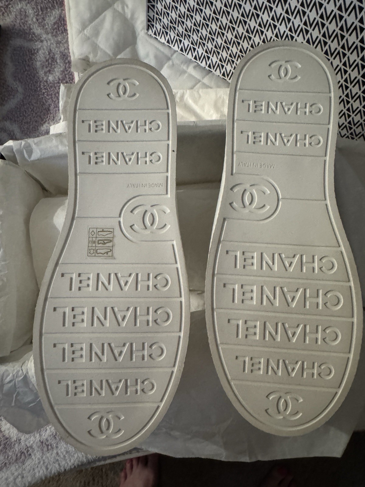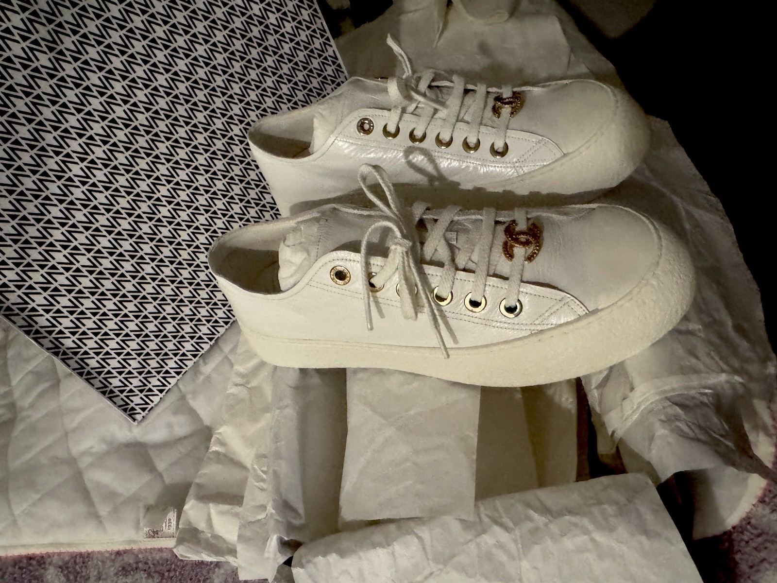 Absolutely love these Chanel sneakers! The white lambskin is buttery soft, and the gold medallions add such a luxurious touch. They’re surprisingly lightweight and comfortable—perfect for everyday elegance. The extra laces are a nice bonus, and the classic Chanel logo on the heel elevates the look. Even though they’re sold out everywhere, getting them brand new at this price feels like a steal. They fit true to size (41.5 is a US 11), and the quality is everything you’d expect from Chanel. Sad I can’t wear them, but thrilled someone else will—these are a statement piece worth every penny!