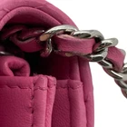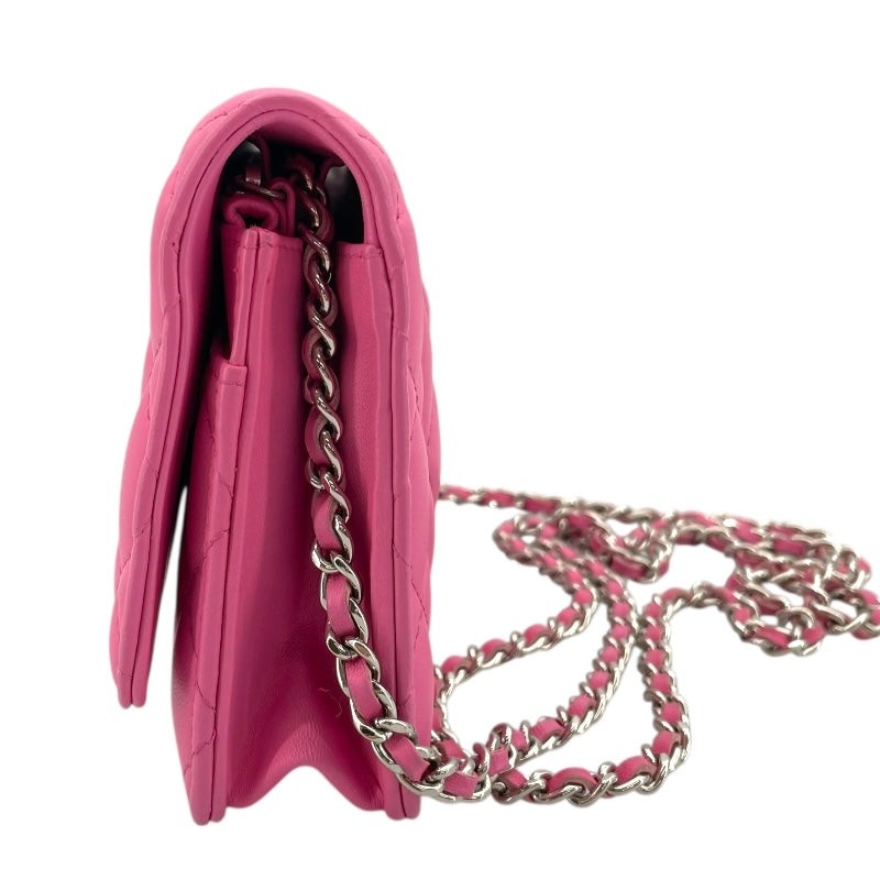 This CHANEL Chain Wallet is a gorgeous pink lambskin piece with silver hardware, perfect for adding a chic touch to any outfit. Despite minor wear on the strap, small scratches on the fittings, and some retouching, it remains stunning. The compact size is practical, and the snap closure keeps everything secure. A stylish and functional must-have for any CHANEL lover!