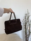Vintage bag so there’s some minor wear on the outside but the inside is PRISTINE. seriously gorgeous. 100% authentic. Going for $2,100 on ClothesMentor.com Elevate your style with this stunning CHANEL Chain Bag in a rich brown hue. Crafted from premium suede, this designer tote bag is perfect for the modern woman who loves to make a statement. The bag features a zip closure, inner pockets for added convenience, and a brown handle/strap that complements the overall design. The CHANEL Chain Bag is a must-have for any fashion-forward woman. It is an excellent choice for carrying all your essentials while looking effortlessly chic. With its classic designer theme and high-quality construction, this bag is sure to become your go-to accessory for any occasion.
