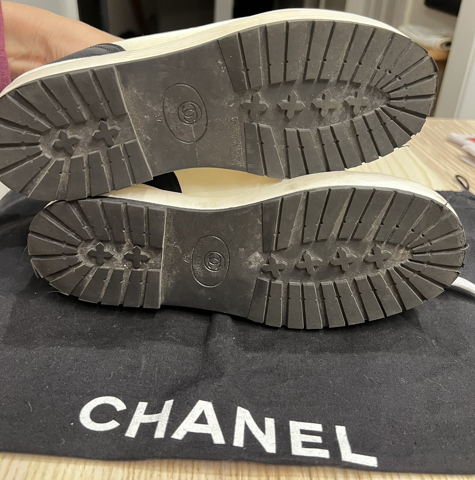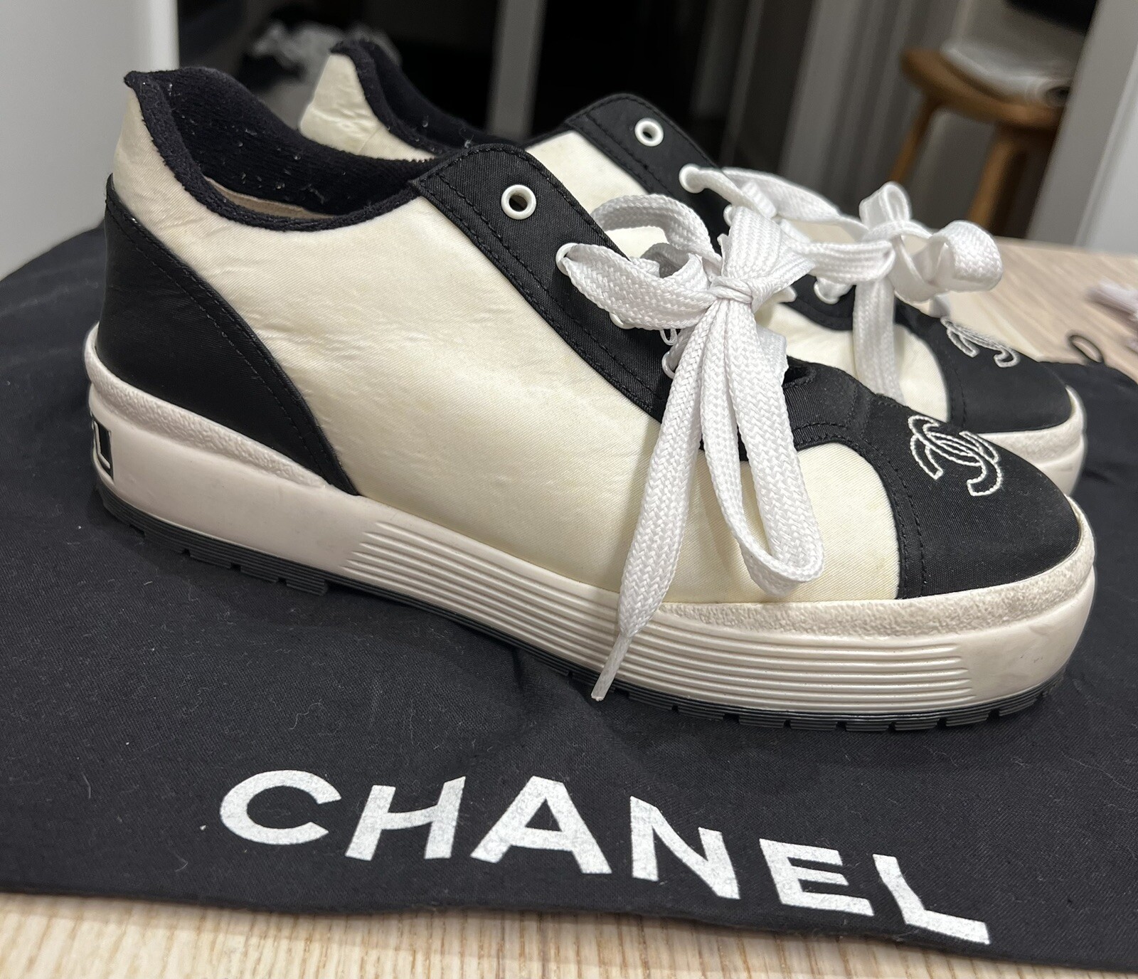 Gorgeous pair of Chanel size 37 black - white fabric sneakers Large CC logo on front Made in Italy Overall very good pre-loved condition; some light discolorations on rims/borders of soles; light outsole wear; dust bag included
