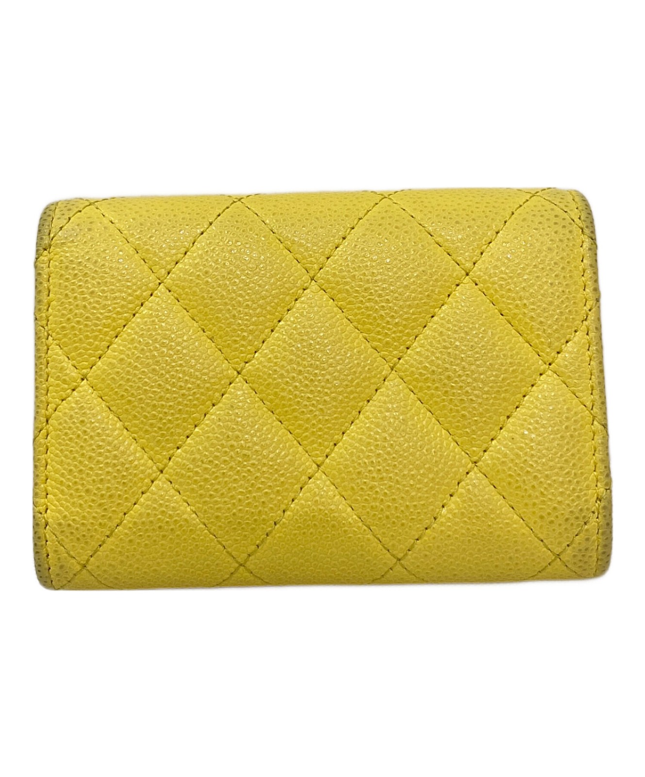 This CHANEL tri-fold wallet is a gorgeous find! The vibrant yellow caviar skin is durable and stylish, showing only slight signs of previous use. At 7x10.5cm, it's compact yet functional, perfect for everyday elegance. The B rank means minor wear, but it still looks fantastic. A must-have for any CHANEL lover!