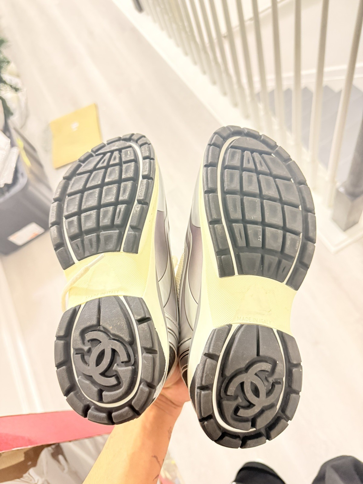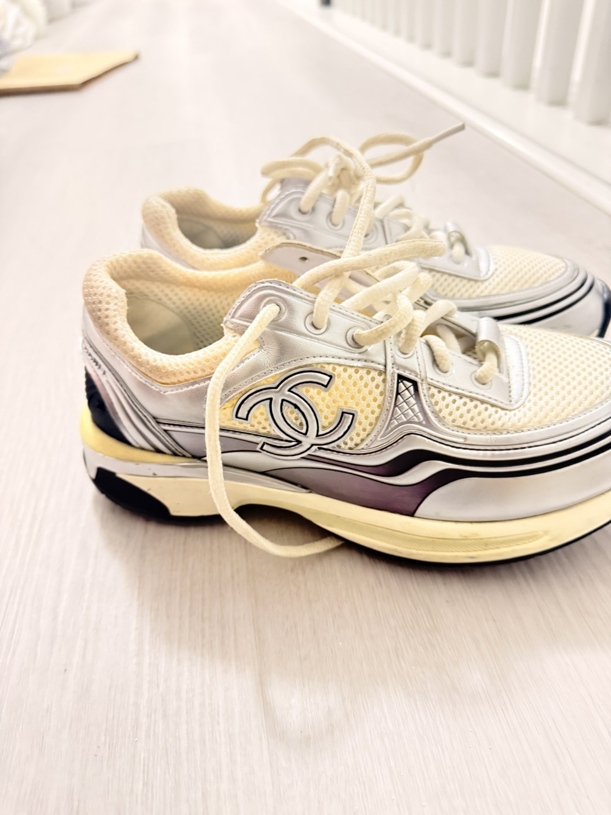 The product is a pair of women's CHANEL sneakers in size 42, featuring a white and silver color scheme with designer CC logo accents. These lace-up sneakers are part of the CHANEL Coco product line and are designed for casual occasions during the summer and spring seasons. Made of leather, the sneakers offer comfort and are branded with the iconic CHANEL logo. Perfect for women who value fashion and style, these athletic shoes are a statement piece in any wardrobe. No box