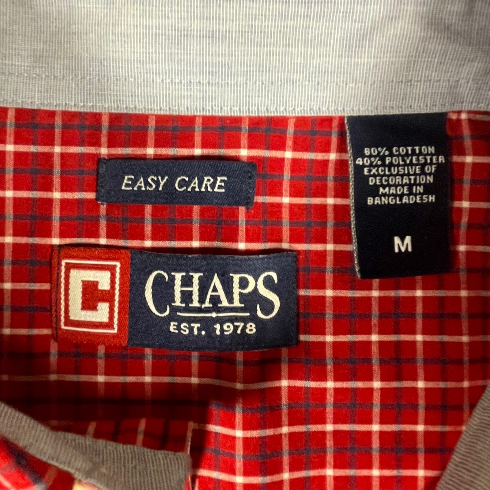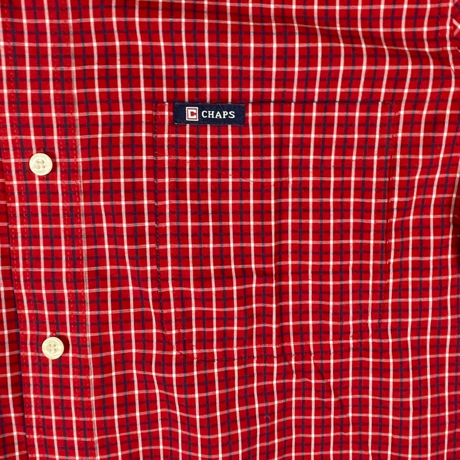 A men's short sleeve button down shirt by CHAPS in a classic red plaid pattern. This shirt features a button-down collar and a single chest pocket with the CHAPS logo. Designed for ease of care, it offers a comfortable fit for everyday wear. Measurements: • Chest (pit to pit): 21 in • Length (shoulder to hem): 29 in • Sleeve Length (shoulder to cuff): 9 in Keywords: chaps shirt, mens plaid, button up, short sleeve, casual shirt, red plaid, easy care, classic fit, work shirt, everyday wear, button collar, chest pocket • ACURATE MEASUREMENTS ARE PROVIDED IN PICTURES • I SHIP EVERYDAY >>> FAST • 5 STAR SELLER • 20% OFF BUNDLES (2 or more) & $4.99 Shipping! • Over 1,500+ items in stock & New Arrivals Daily