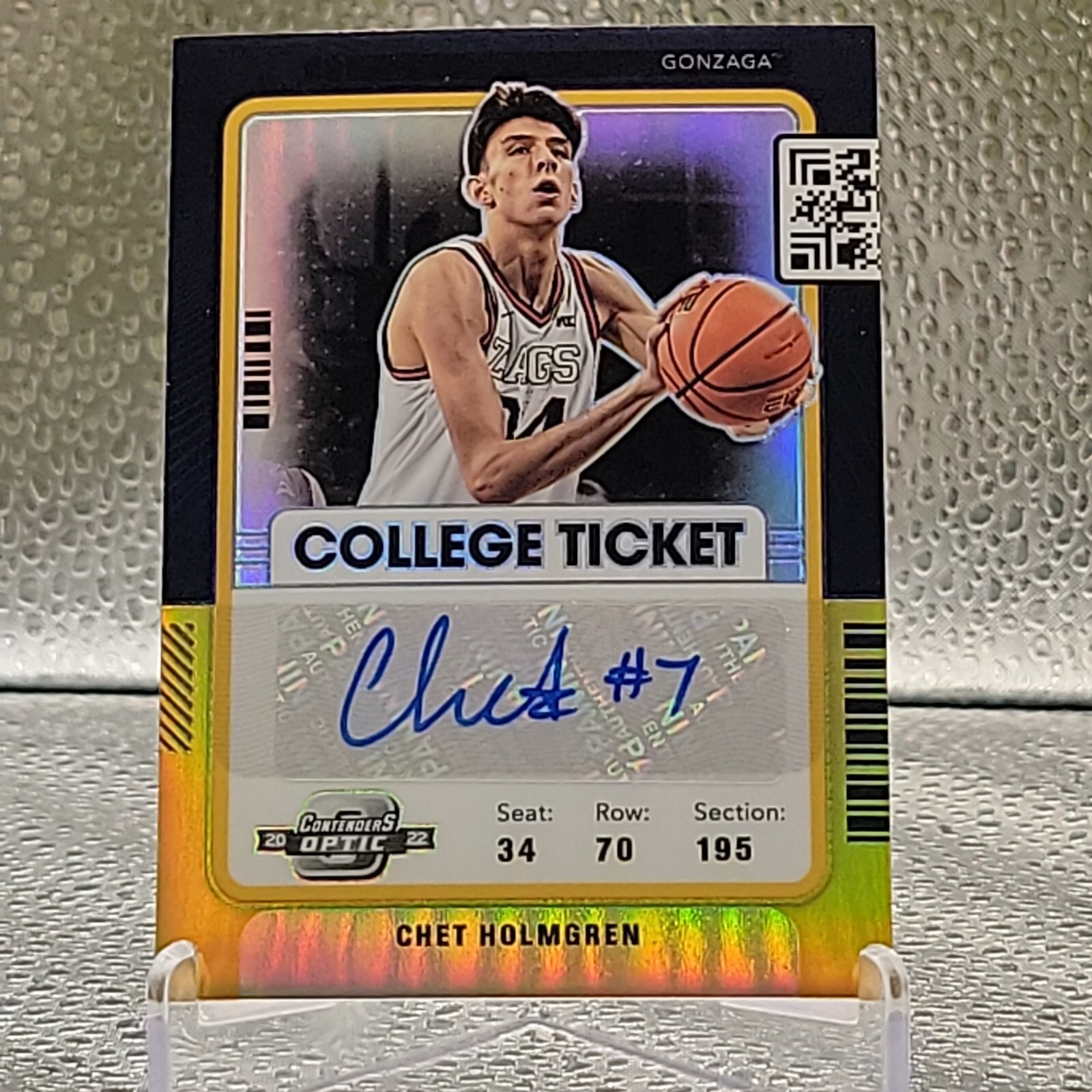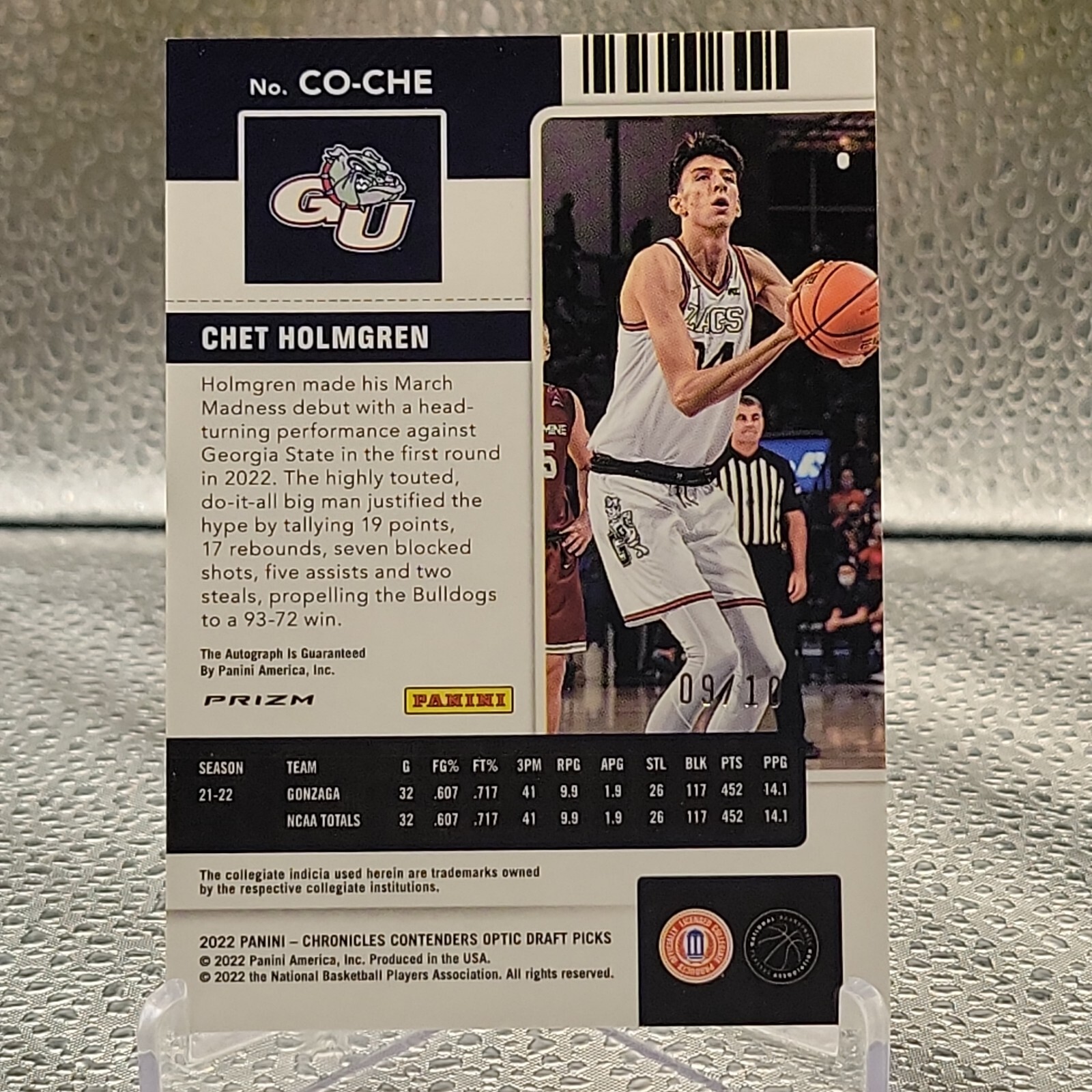 Elevate your sports memorabilia collection with the 2022-23 Panini Chronicles Draft Picks Chet Holmgren Optic Gold Rookie Autographed Card, a must-have for basketball enthusiasts and collectors alike. Featuring the promising talent from Arizona Wildcats, this card is a shining star in any collection, with its distinctive Gold RC AUTO /10 designation setting it apart from the ordinary. The card, numbered CO-CKO, captures the essence of the National Collegiate Athletic Association's high-energy basketball scene and is a testament to Holmgren's potential. The premium craftsmanship by Panini ensures that this collectible retains its allure, making it an exceptional find for fans of the sport and collectors pursuing unique, ungraded sports trading cards.