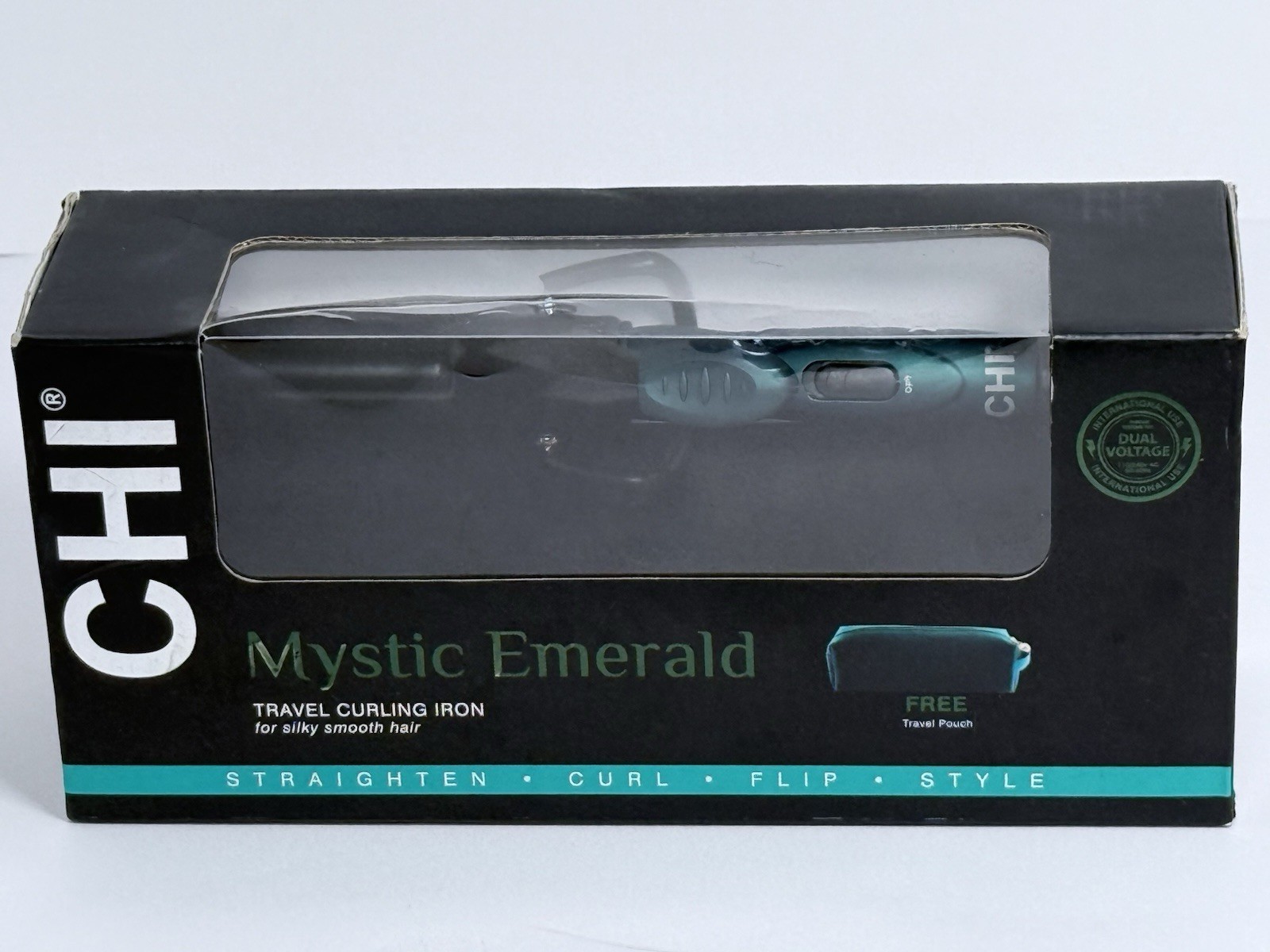 Brand new in box, CHI Mystic Emerald Travel Curling Iron With Travel Pouch. Straighten, Curl, flip, & style