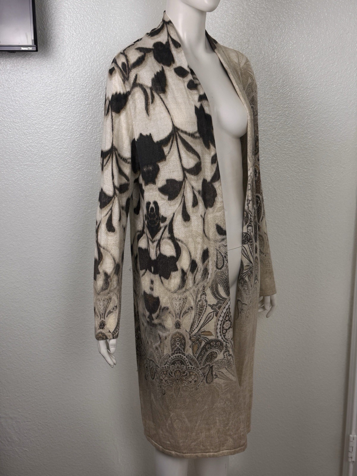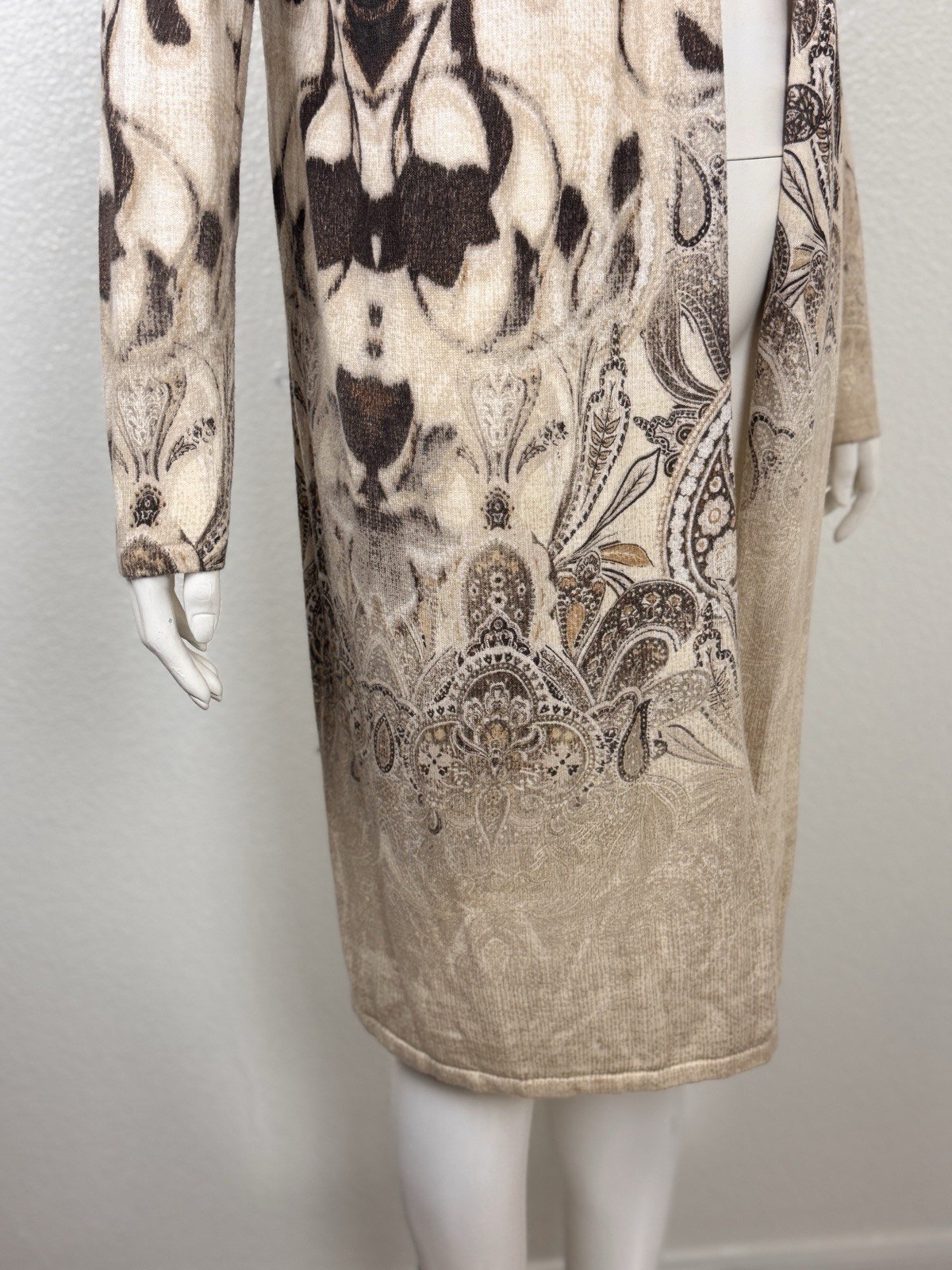 The CHICO's Long Cover Up Duster is a stylish and versatile cardigan made from cotton in shades of brown. This size 1 cardigan features long sleeves and a regular fit, making it perfect for women looking to add a touch of sophistication to their outfit. The Chico's brand ensures quality and style, making this duster a must-have piece for any women's wardrobe cardigan in good condition.