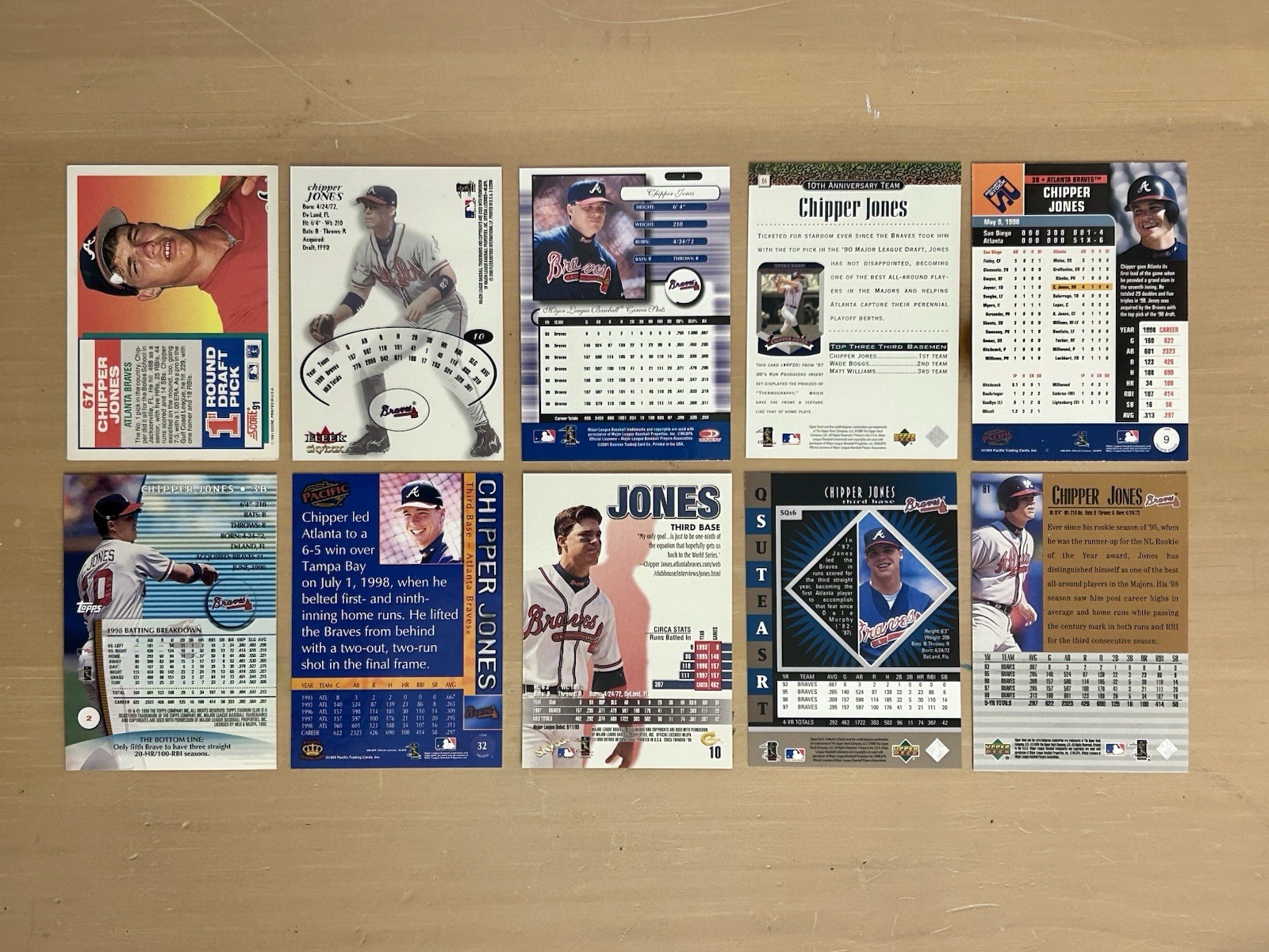 *CHIPPER JONES* 12 Card HOF Lot w/ RC! 1998-2000 Mid-High Grade Premium! Braves! These cards come from the personal collection of my youth! I’m just downsizing my collection one sale at a time:) The cards are all nice — though not perfect. Check out the pictures to examine the condition for yourselves. These lots that I’m selling are a good way to build your collection of Hall of Famers on a budget! Starting at only $.50 each or less!!! Shipping on these lots will be free. They will come to you secured inside of a couple of semi rigid holders, in a plain white envelope. Thanks for checking out my cards. I intend to run HOF auctions every week until the clutter is gone from my basement!!! Please reach out if you have any questions or requests of players that you would like to see… -Mac