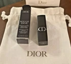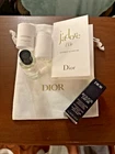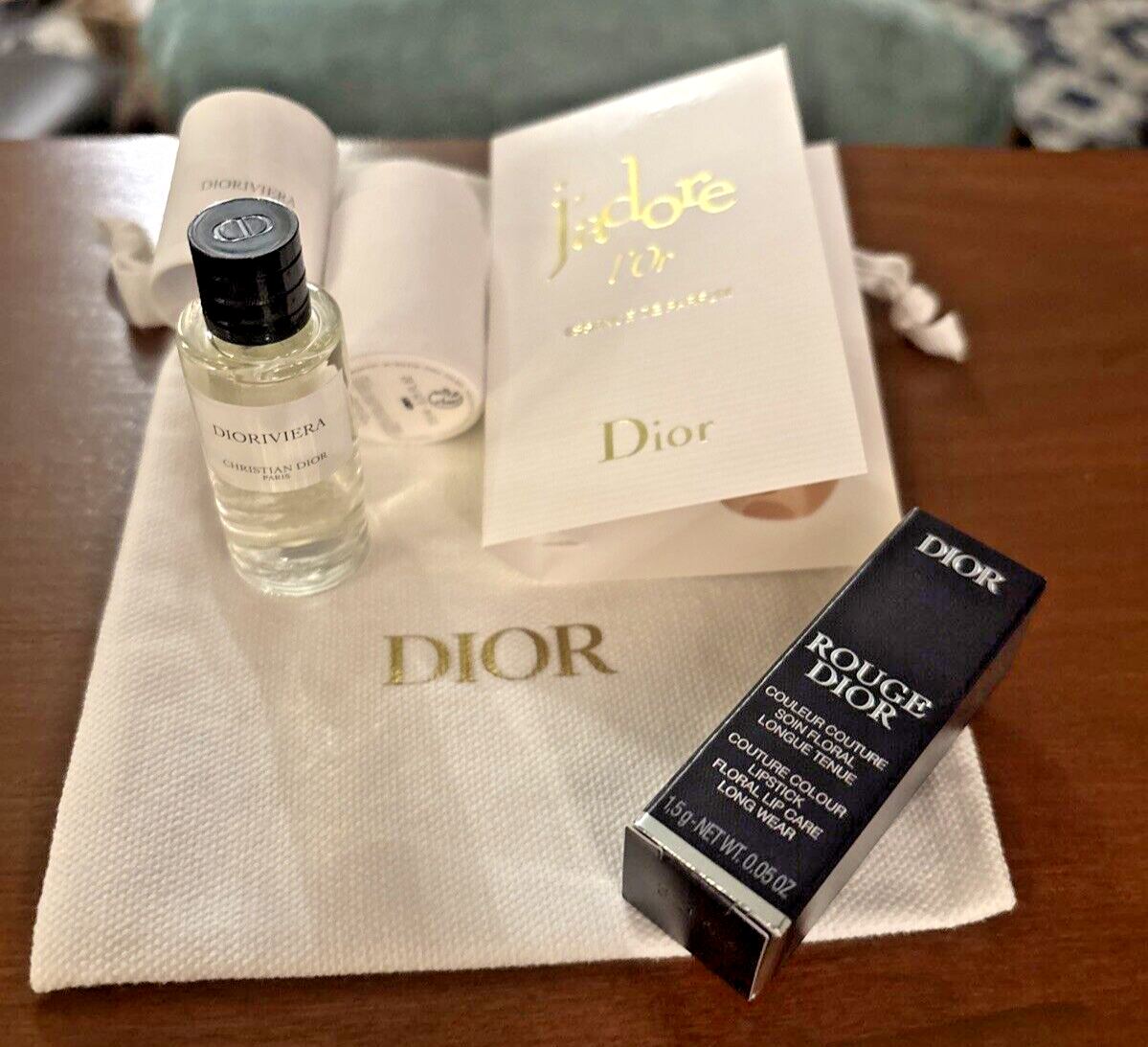 4 pc set from November Oct 2024 1. Mini bottle privee parfum Dioriviera - $365 full size bottle - this is .25 oz! 2. Mini Dior LIPSTICK in best seller Red - great for you clutch 3. Fabric pouch Dior printed in gold on front 4. small vial spray fragrance of DiOR'S J'adore - Best sellers! . DIOR DESCRIBES: lipstick The longwearing Rouge Dior provides 24 hours* of comfort and 12 hours** of true color thanks to a hydrating formula infused with floral lip care. The velvet finish has a smooth, enveloping texture for full, soft lips. Without compromising comfort, these velvet lipsticks have a barely-there feel that leaves lips feeling plump and smooth. This set includes: - 999 in a velvet finish: the iconic Dior red "The essential" A streamlined storage pouch designed to reduce waste. A 100% cotton pouch