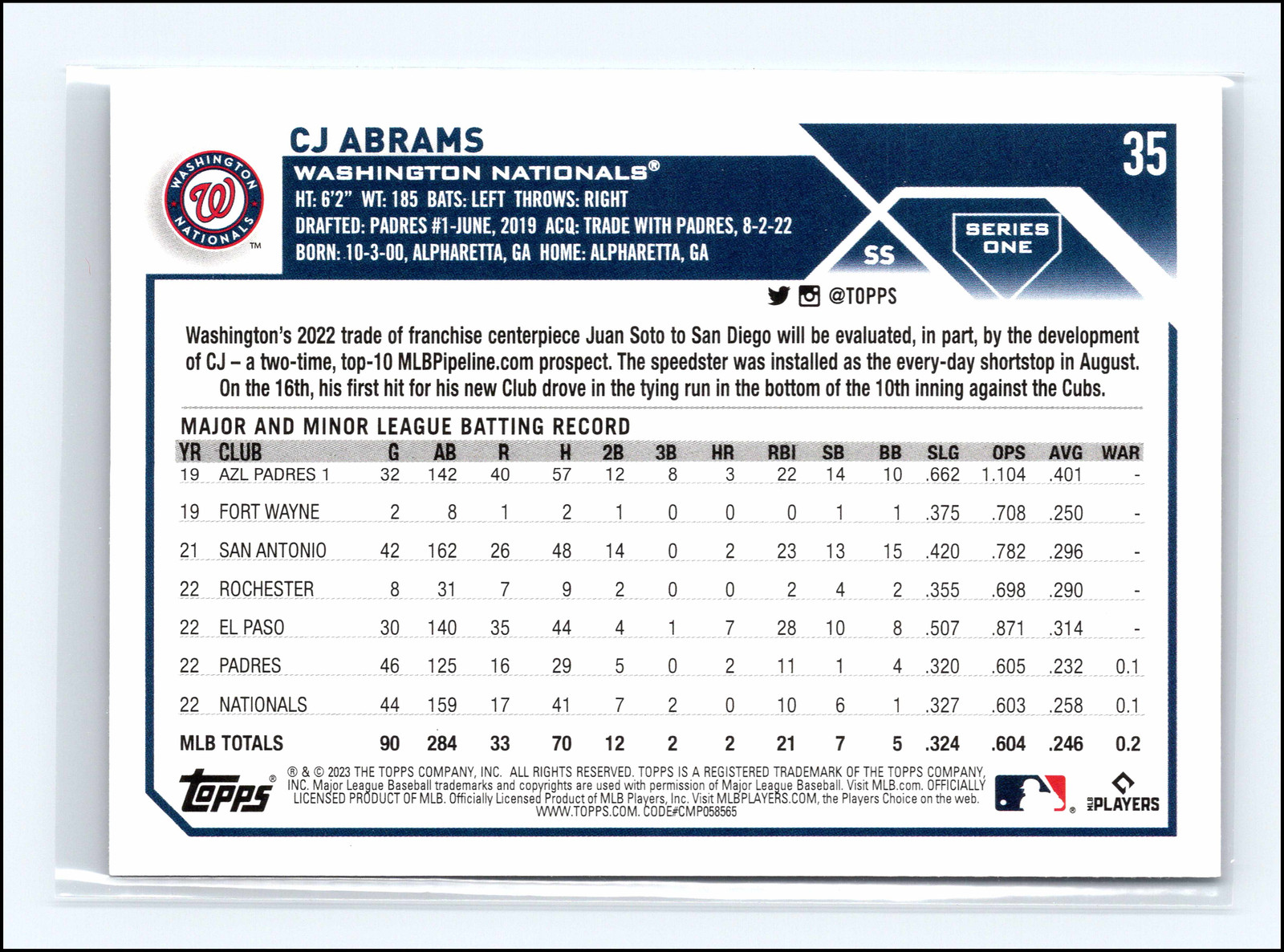 CJ Abrams 2023 Topps Washington Nationals #35 Cards are ran through a scanner. Any lines shown are on the sleeve not the card. If you would like additional pictures just ask. Check out our store for more great deals! Thanks