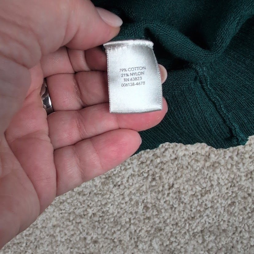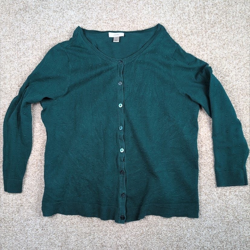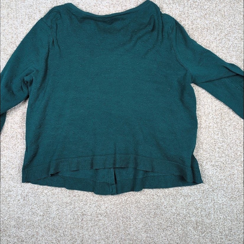 CJ Banks women's cardigan sweater in a rich green hue. This knit piece features a classic button-front closure and a subtle allover textured dot pattern adding visual interest. The v-neckline and long sleeves offer a comfortable and versatile silhouette. Ribbed detailing at the cuffs and hem provides a polished finish. Please see pictures for measurements. Please compare the measurements to something you already own. From Smoke Free/Cat Friendly Home Keywords: CJ Banks sweater, plus size cardigan, teal knitwear, button up sweater, textured knit, v-neck cardigan, long sleeve sweater, casual knit, everyday sweater, fall fashion, winter layering, comfortable knit