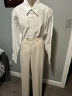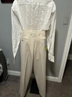 These Claiborne stone flat front gabardine pants are a stylish and versatile choice for various occasions. Made of polyester fabric with moisture-wicking properties, they feature a high rise and straight leg fit in size 38/32. The breathable fabric makes them suitable for all seasons. The pants come in a beige color with a zip closure, ideal for travel, parties, casual wear, work, or business settings. CONDITION NEW WITH TAGS $65.00 MEASUREMENTS WAIST 38 INCHES INSEAM 32 INCHES MATERIAL CONTENT 100% POLYESTER COLOR STONE