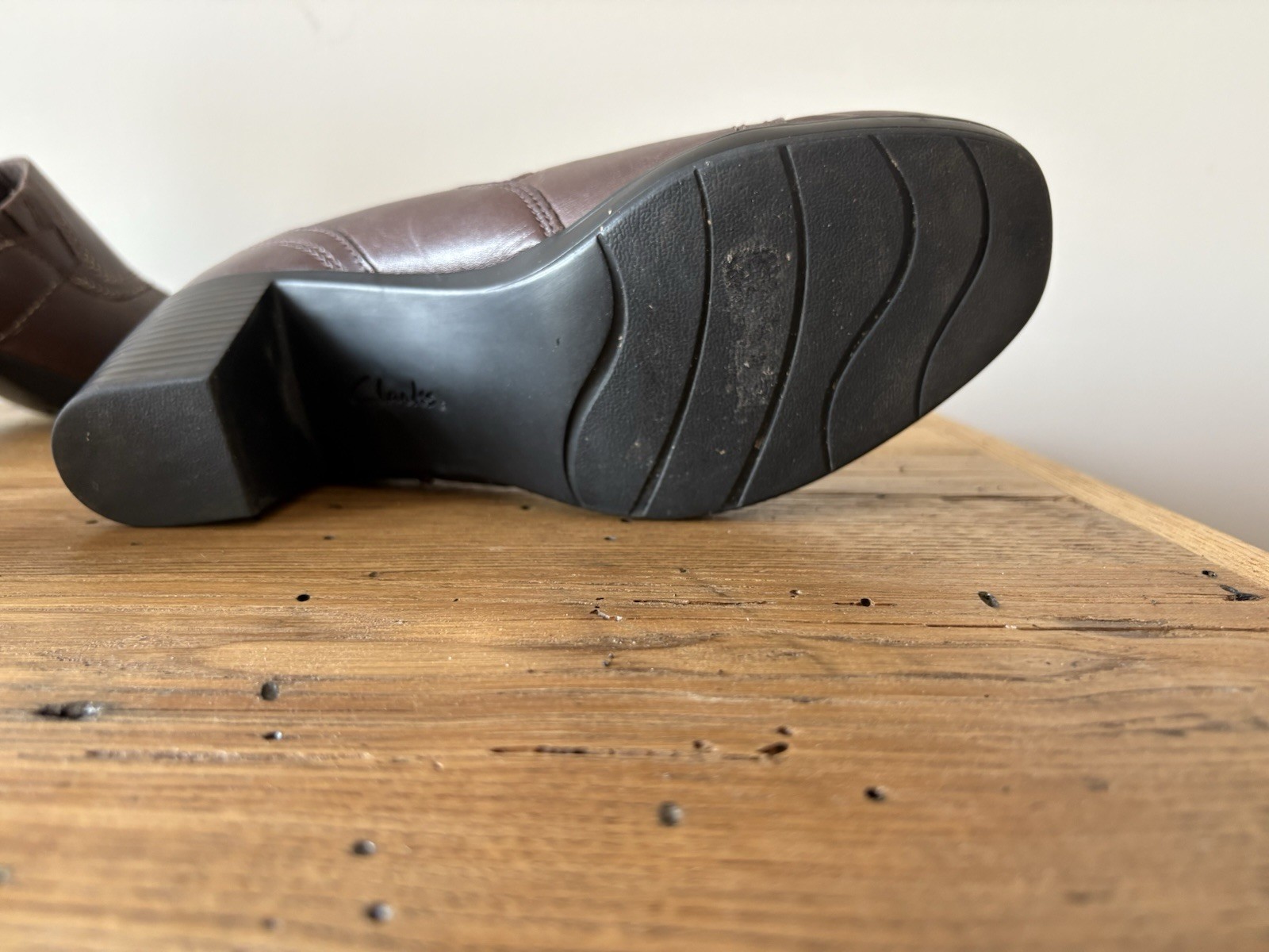 Explore the perfect blend of comfort and style with these CLARKS BENDABLES loafers. Meticulously crafted for the modern woman, these brown leather pumps feature a sleek round toe and a sturdy block heel measuring a comfortable mid-height of 2 to 2.9 inches. The slip-on design ensures ease of wear while the fabric lining and insole materials offer a cushioned step, making them an ideal choice for a day at the office or a casual outing. With versatility in mind, these shoes are designed to complement various occasions, from activewear to workwear, and even for travel or special occasions. The durable synthetic outsole provides stability, and the shoe's size 9 medium width ensures a snug yet comfortable fit. Whether stepping into the city or embarking on a journey, these heels are a timeless addition to any wardrobe.