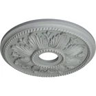 Our ceiling medallion collections are modeled after original historical patterns and designs. Our artisans then hand carve an original piece. Being hand carved each piece is richly detailed with deep , sharp lines, and a truly unique touch. That master piece is then used to create a mould master. Once the mould master is created we use our high density urethane foam to form each medallion. The finished look is a beautifully detailed, light weight, solid construction, focal piece. The resemblance to original plaster medallions is achieved only by using our high density urethane and not vacuum formed, "plastic" type medallions. - Medallions can be cut using standard woodworking tools to add a hole for electrical or a ceiling fan canopy. - Medallions are light weight for easy installation. - They are fully primed and ready for your paint. If you have any questions feel free to ask. These are in stock and available for immediate shipment. Dimensions: 18-1/8 in. Outside Diameter x 3-1/2 in. Inside Diameter x 2-3/4 in. Projection x 5-1/8 in. Canopy Lightweight for quick and easy installation Exquisite detail with huge collection of exclusive designs Can be cut, drilled, glued or screwed with common tools. Factory primed and ready for paint or faux finish Add a high-end upgrade inexpensively. Instant renovation with minimal time and effort
