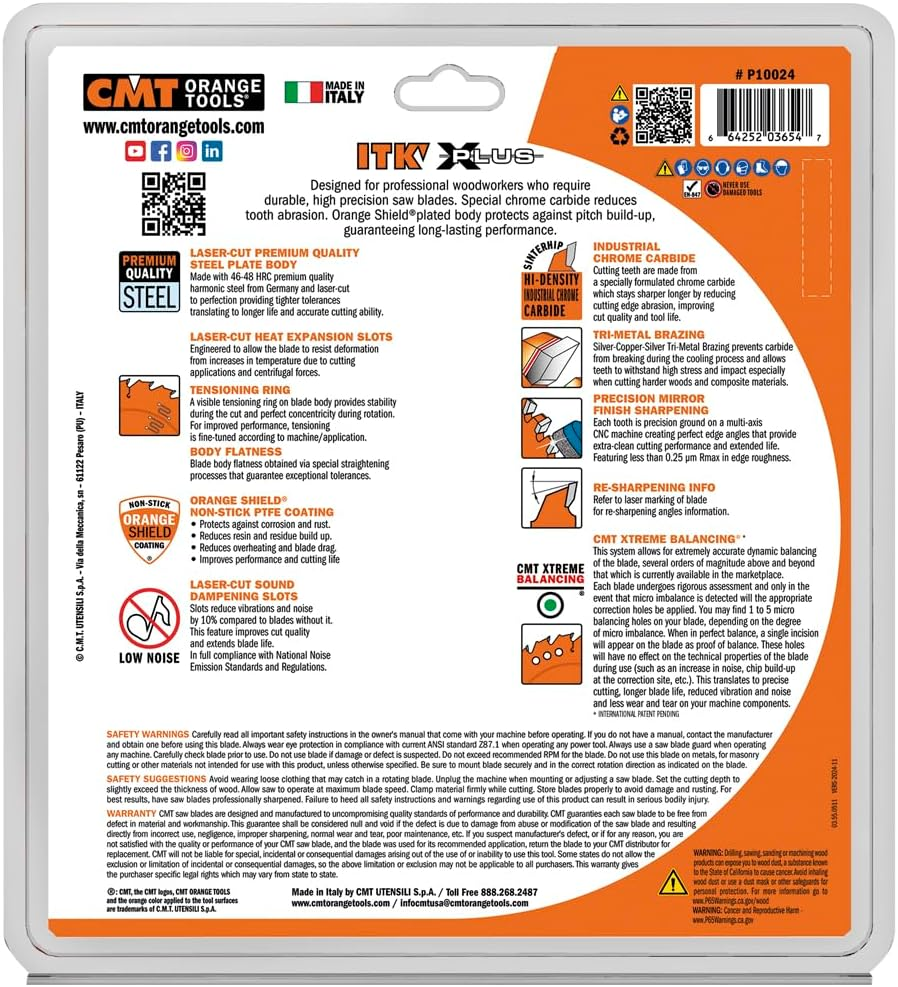 For fast and excellent rip cuts thanks to the shear angle design. Use on radial arm saws, miter saws, table saws for cutting soft and hardwood. 0.094 kerf thickness, 0.063 plate thickness, 20° cutting angle, 10° ATB+Shear grind. Thin kerf reduces material waste, shear angle produces smooth cuts and improves cutting speed. Special Carbide prevents from material failure, Non-Stick Orange Shield protects against corrosion.