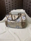 This Coach Alexandra Chain Link Clover Signature shoulder bag is a stylish and functional accessory for women. With a unique multicolor exterior and silver hardware, this bag is perfect for any occasion. It features a zip closure, double handles, and a bag charm accent.The bag has a satin lining and is made of leather and satin materials. It has a medium/large size, measuring 14.5'' at the top, 10'' in height, and 4'' in depth. The strap drop is 11'' and the handle/strap material is also leather. This classic-themed bag is part of the Coach product line and has a signature c print pattern. It comes with a bag charm accessory and is perfect for any fashion-conscious woman. I'm selling the matching wallet with this bag...the wallet has some cracks on the inside where it bends ,see photos. Bag is pre-owned so may have marks ,no stains or rips! May have some spots that need cleaning , nothing that won't come out with the proper cleaning .yes, has a bag tag..
