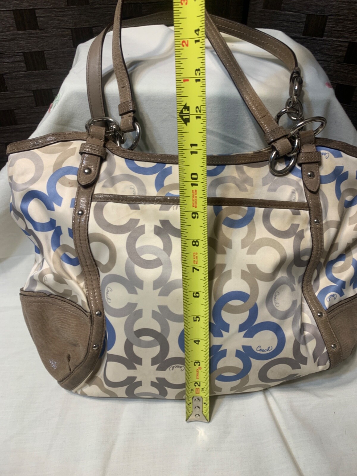 Accents: Logo, wallet Theme: Classic Closure: Zip Occasion: Casual Accessories: Bag Charm Finish: shiny UPC: Does not apply Vintage: No Hardware Color: Silver gtin13: Does not apply Bag Width: see photos Lining Material: Fabric Handle/Strap Material: Leather Hardware Material: Silver tone Product Line: Coach Features: Bag Charm, Inner Pockets MPN: F20806 Shape: Rectangle Handle/Strap Color: taupe Model: Coach Alexandra Fabric Type: Satin Exterior Material: Leather, Satin Personalize: No Style: Tote Exterior Color: Multicolor Handle Drop: See photos Department: Women Lining Color: grey Handle Style: Double Handles Brand: Coach Size: Medium/ Large Handmade: No Pattern: Signature c print