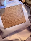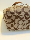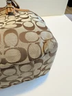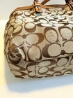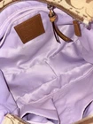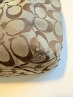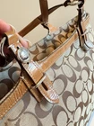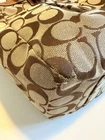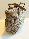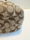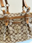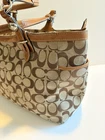 The COACH Tote Bag F15146 is a large rectangular shoulder bag made of beige canvas and caramel leather, featuring gold hardware accents. It has a zip closure, brown double handles, and a stylish buckle accent. The bag is designed for casual or business occasions, with a versatile matte finish and a classic logo pattern. This designer bag from Coach Outlet includes inner pockets and a leather lining in a purple color, making it a fashionable and functional accessory for everyday use. Made in Japan, this bag is a perfect blend of classic style and modern sophistication. Corners are very used… pls see photos before buying NO RETURNS