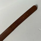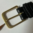 This is a men's black leather dress belt made by Coach. It features a solid brass buckle and is 1 1/8" wide. The belt is size 34 (85 cm) and has an adjustable buckle for a comfortable fit. The belt is designed with a classic, solid pattern and is made in the United States. It has a designer and USA theme. OVERALL belt length is 39” SEE last photo for minor wear on brass buckle