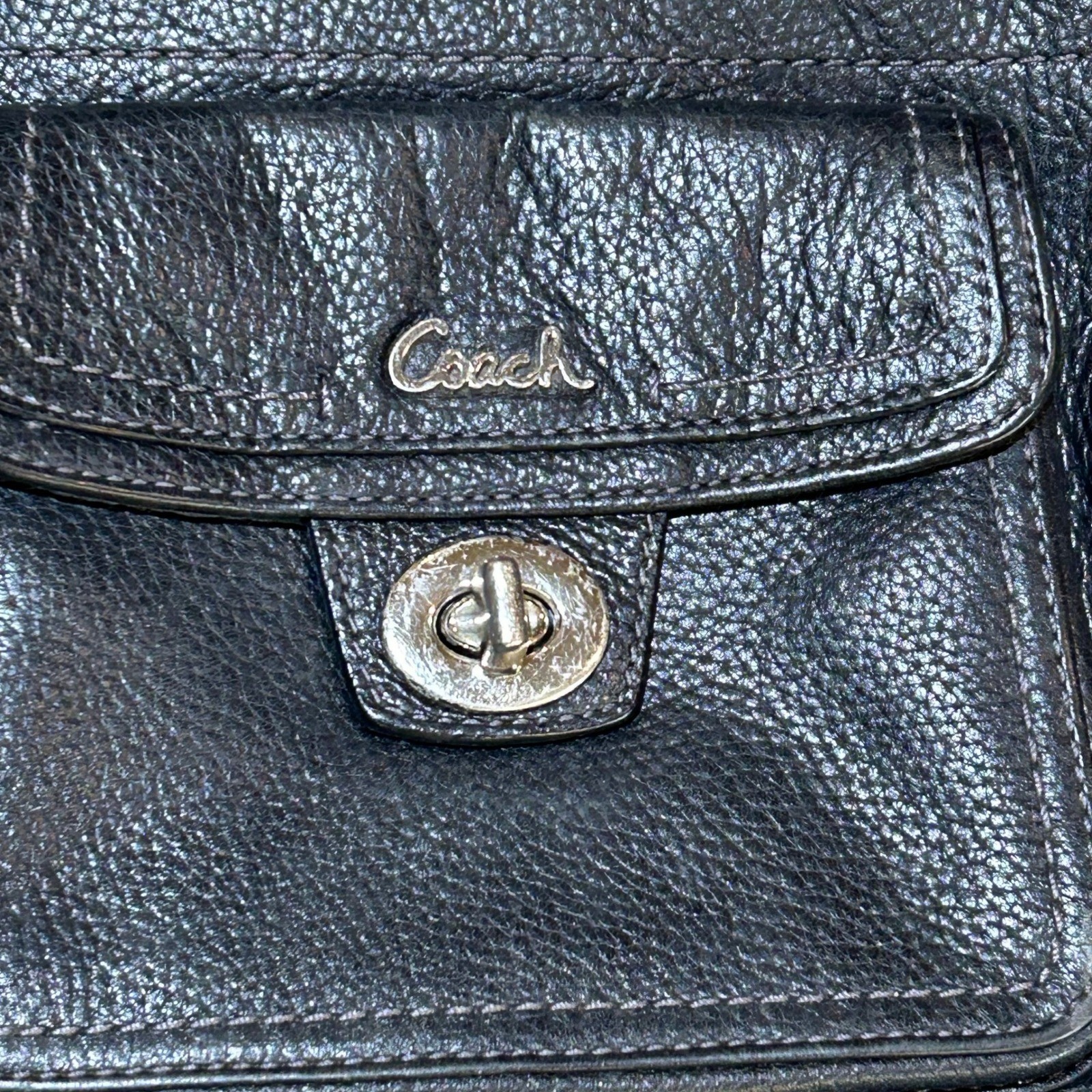 Elevate your everyday style with this charming COACH crossbody bag. This compact yet functional purse features a classic black pebbled leather exterior, accented by silver-tone hardware. The turnlock flap pocket adds a touch of elegance, while the adjustable strap allows for comfortable wear across the body. Inside, the lined interior offers just enough room for essential items. This versatile bag is perfect for running errands, a casual lunch date, or a night out with friends. * Purse opens up but there is a slight issue with zipper shown in picture 4 * * Not original zipper pull - replaced * * Slight wear at bottom of purse and at strap shown in pictures * Measurements: • Height: 7.5 inches • Width: 9 inches • Strap drop length: 22 inches Exterior Material: Leather, Pebbled Leather Style: Crossbody Exterior Color: Black Department: Women Lining Color: Black Handle/Strap Color: Black Handle/Strap Material: Leather, Fabric Lining Material: Fabric Hardware Color: Silver Pattern: Pebbled Closure: Turn Lock, Zip Bag Height: 8 in Bag Depth: 3 in Keywords: COACH, Crossbody Bag, Leather Purse, Black Bag, Turnlock, Flap Pocket, Small Bag, Designer Handbag, Pebbled Leather, Adjustable Strap, Silver Hardware, Everyday Bag, Casual Bag, Weekend Bag