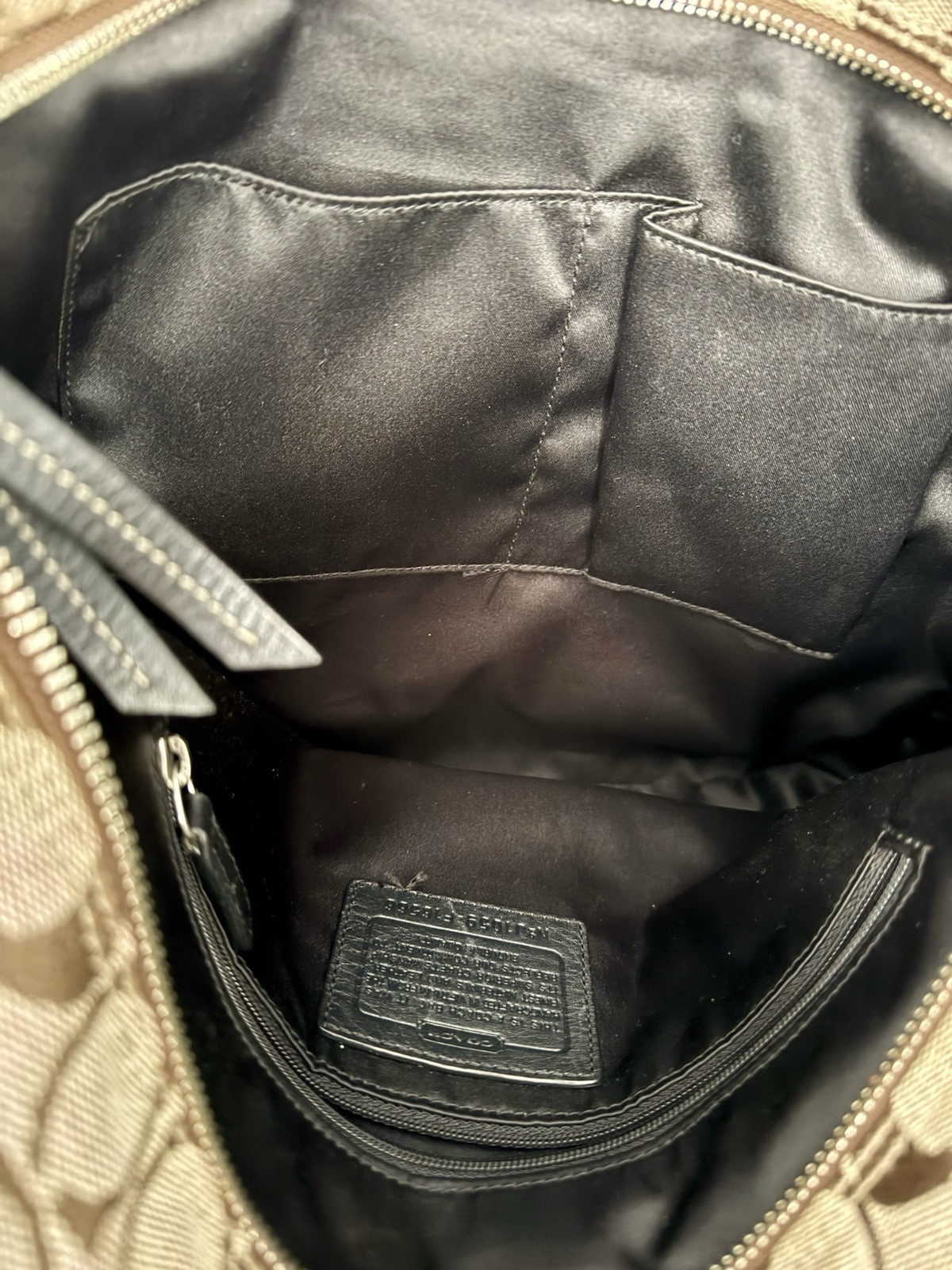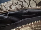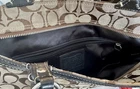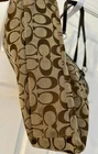 This COACH Brown Signature Logo Gallery East West Shoulder Bag #16566 is a must-have for any fashion-forward woman. The bag features a rectangular shape with a tan and brown exterior made of jacquard fabric and leather. The double handles and strap accents add a touch of elegance to the bag, while the Coach emblem and pleats create a sophisticated silhouette. The bag is lined with brown satin fabric and has inner pockets, outer pockets, and a mobile phone pocket for added convenience. The bag measures 14in x 12in x 3in and has a handle drop of 9 inches. The hardware is made of silver and also trimmed with Coach emblems. This bag is perfect for any occasion and is a great addition to any wardrobe.