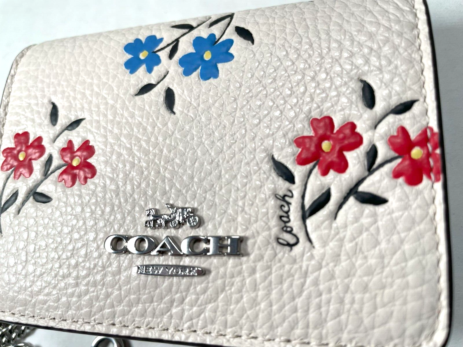 COACH Mini Wallet Pebble Leather with Metal Chain Shoulder strap New with original price tag Absolutely Authentic! Color: Chalk Multi Style: CU005 MSRP: $198.00 Description: Refined pebble leather with Floral Print Front logo metal, in silver tone Chain strap with 22.50" drop for shoulder or crossbody wear Back slide pocket Inside open pocket and slide pocket Fabric lining brown color Length: 4 inches Height: 3 inches Width: 1 inch Please let me know if you have any questions. Comes from a smoke free house. -------------------------------------------------------------------------------------------------------------- Your purchase will be shipped in 24 hours once payment is received and verified. You will be notified of the shipping date via E-Mail -------------------------------------------------------------------------------------------------------------