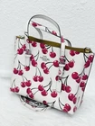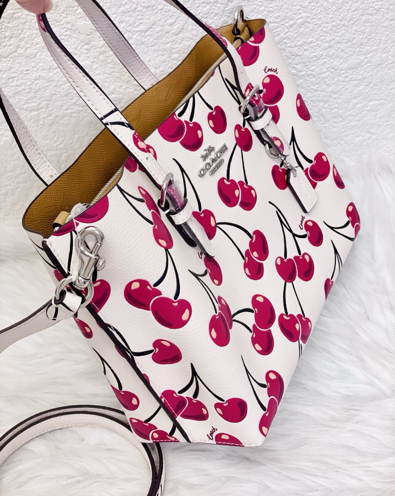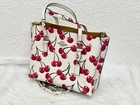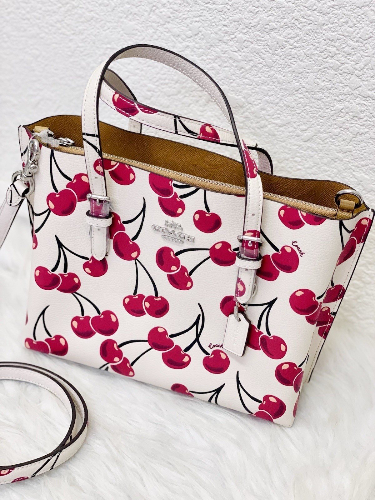 🍒COACH CY695 Mollie Tote Bag 25 With Cherry Print Double Face & Pebble Leather 100% Authentic Retail Price: $428.00 USD Color: Chalk Multi Style No. CY695 Size: (W) 9.75" (H) 7.5" (D) 4.75" Handle Drop: 4.75" Strap Drop: 22" Adjustable/Detachable Chalk Multicolor Refined Pebbled Leather w/ embossed "Cherry" print Closure: Front: None; Middle: Top Zip; Back: None Handles/Strap: Chalk Multicolor embossed "Cherry" leather Silver "COACH Heritage Coach" pin mount Hardware: Silver Tone Stitching: Chalk/Saddle Chalk pebbled leather Coach hang tag Lining: Saddle textured leather and fabric Interior: Front: Open; Middle: Top Zip pocket; Back: Open Fast shipping Price is firm