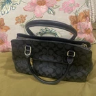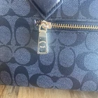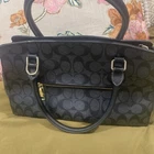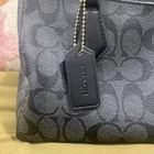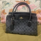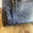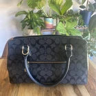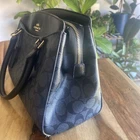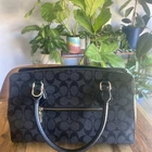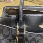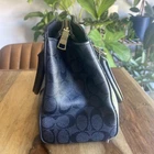 The COACH Darcy Carryall Shoulder Bag in elegant black leather with monogram detailing is the epitome of designer luxury. Featuring double handles and a zip closure, this medium-sized bag is perfect for everyday use. The gold hardware adds a touch of sophistication, while the brown nylon lining provides a stylish contrast. Ideal for the modern woman who values both style and functionality, this COACH handbag is a must-have accessory for any fashion-forward wardrobe. Has never been taken out or worn Been displayed in walk in robe shelf However has minor defects pictured Internally perfect