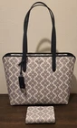 COACH Dempsey Tote 22 Signature Jacquard w Star & Leather Zip Wristlet Black, MSRP $516 COACH Dempsey Tote 22 Signature Jacquard with Star Embroidery Silver/Smoke/Black Multi - MSRP $428 Signature Jacquard and refined pebble leather Fabric lining Detachable strap with 22.5" drop for shoulder or crossbody wear Handles with 4.25" drop Inside zip pocket Snap closure Inside multifunction pocket Four protective feet at base 4.25" (L) x 8.75" (H) x 7.75" (W) COACH Leather Corner Zip Wristlet, Silver/Smoke/Black Multi, NWT - MSRP $88 Refined Pebble Leather Fabric lining Wrist strap attached Zip-top closure Two credit card slots 6.25" (L) x 4" (H) 0.5" (W) FREE Standard Shipping (USA only) Note : International buyer is responsible for any additional tax or cost for shipping to your country. Kindly check with your local customs office for more information.