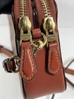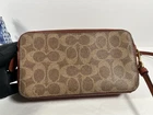 Signature coated canvas, refined calf leather and smooth leather Four credit card slots Double zip closure, fabric lining Center open compartment Detachable long strap with 23" drop for shoulder or crossbody wear 7 1/2" (L) x 4" (H) x 1 3/4" (W) Style No. C6842