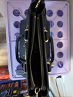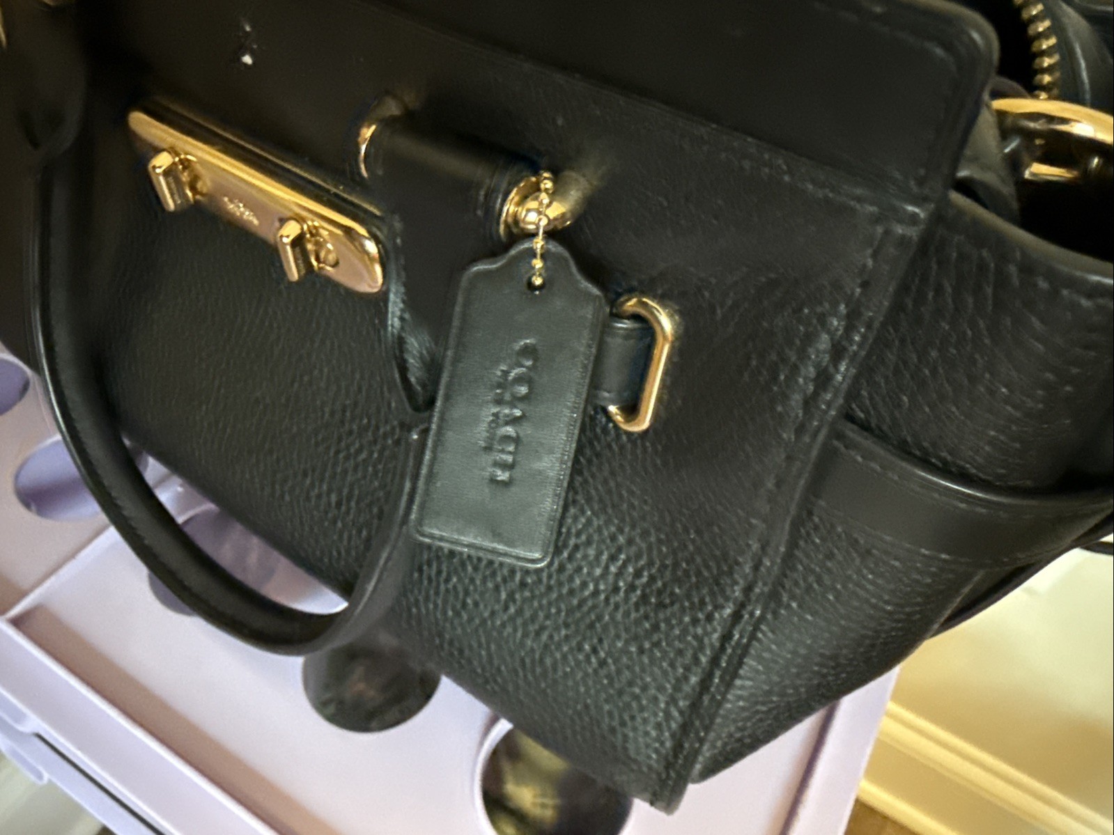 The COACH Lane Satchel Shoulder Bag in Black Pebble Leather with Gold hardware is a classic and luxurious accessory for women. Featuring a medium size with a zip closure and double black handles, this satchel/top handle bag is versatile for travel, casual outings, workwear, and business occasions. The pebbled leather exterior with gold accents adds a touch of elegance, while the interior is lined with fabric and includes inner pockets, a detachable cross-body strap, and a limited edition audio pocket. The Coach Lane model is part of the brand's designer luxury product line, making it a desirable addition to any wardrobe.