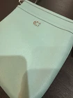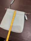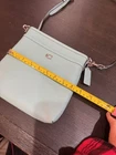 This Coach crossbody bag in a light teal color is a must-have for any fashion-forward woman. The bag features a zip closure and a crossbody strap handle style, making it perfect for travel and casual occasions. The canvas and leather exterior materials, along with the silver hardware and accents, create a durable and stylish bag that will last for years to come. The lining material is also canvas, and the bag has zipper accents for added flair. Don't miss out on this colorful and versatile piece from Coach! Great condition. No stains or tears