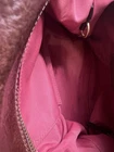 This is a lovely purse, no ink marks or stains It has 3 tags and one is metal The leather is not cracked or torn The width is 5 “ Length 12 “ Height 8” No shoulder strap