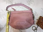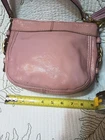 Elevate your accessory collection with the COACH Pink Patent Leather ZOE Hobo Handbag. This chic top handle pouch exudes sophistication with its pebbled purse finish and elegant brass hardware. The compact design, measuring 9 inches in width and 7 inches in height, is perfect for essentials, making it an ideal choice for business, casual outings, or evening cocktails.The bag's exterior is a stunning pink patent leather, complemented by a beige lining, ensuring a pop of color that stands out. With features like a zip closure, inner pockets, and a leather lining, functionality meets style. The gold hardware adds a touch of glamour, while the bottom studs prevent wear. A logo accent and bag charm provide the finishing touches to this exquisite piece.
