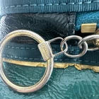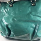 The COACH Poppy Liquid Gloss Large Teal Shoulder Purse Handbag Tote is a stylish and spacious handbag featuring a solid teal exterior made of patent leather, with silver hardware accents. The large size and tote style make it practical for carrying everyday essentials. The green patent leather handles add a pop of color, while the beige fabric lining provides a clean and classic look. This handbag by Coach is a fashionable and versatile accessory for women, perfect for adding a touch of sophistication to any outfit.