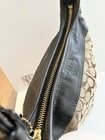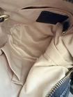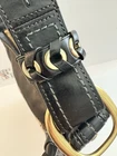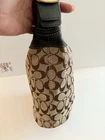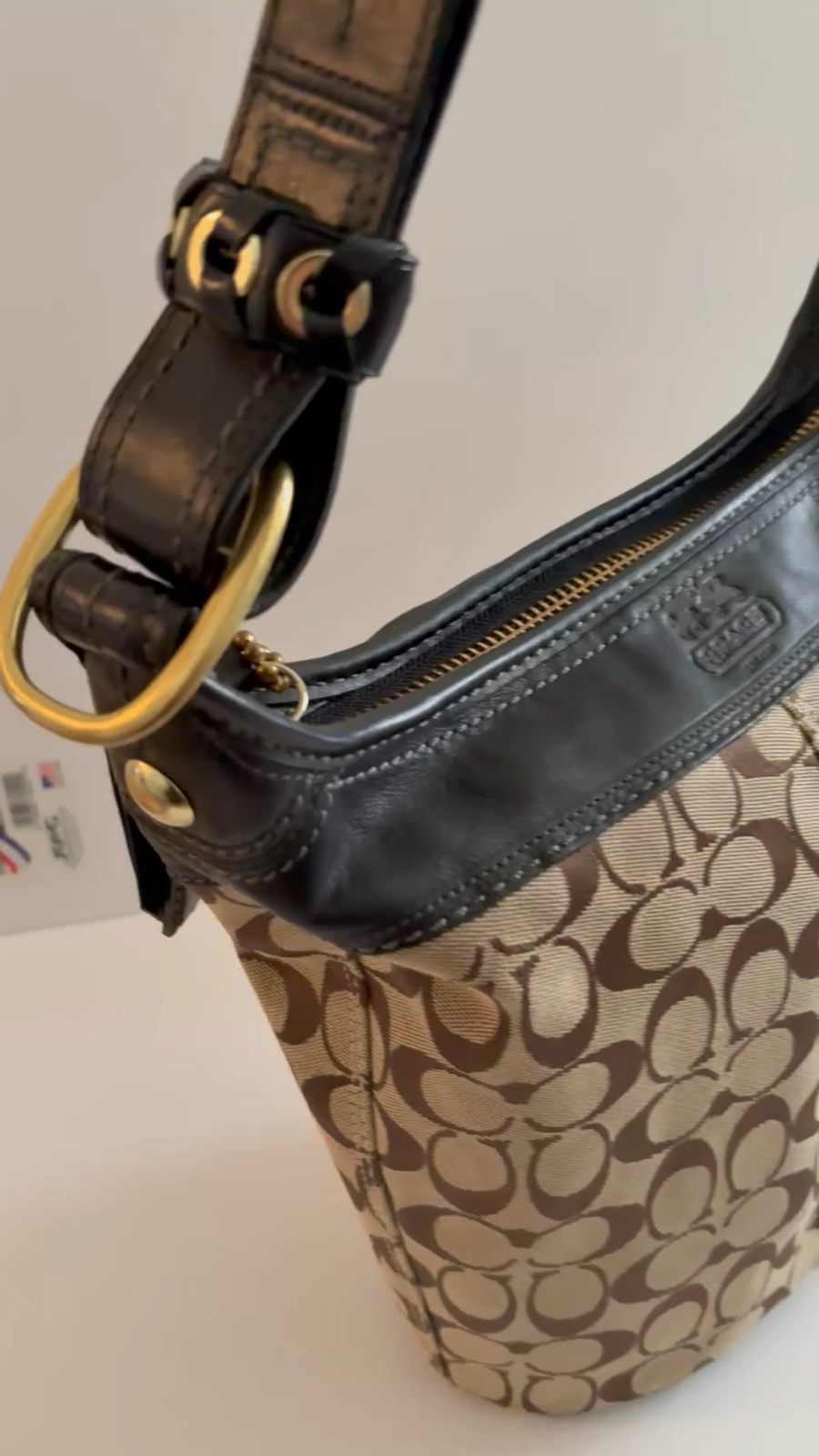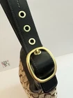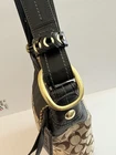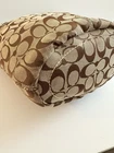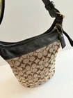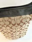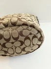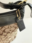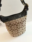 The COACH SIGNATURE DUFFLE BLEEKER HOBO /CROSSBODY BAG Style #11437 is a large, stylish duffel bag in a khaki and black exterior color with gold hardware accents. It features a zip closure, black leather handle/strap, and a mobile phone pocket for added convenience. The bag has a signature Coach logo pattern and a matte finish, making it perfect for travel occasions. Additionally, it includes a bag charm and a 12-15 inch strap drop for versatility in wearing it as a crossbody or hobo bag. Made from a combination of canvas and leather, this designer bag from Coach is a chic and functional accessory for women on the go. Bag has some pen lines inside Good condition