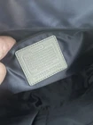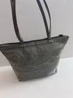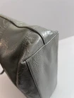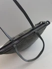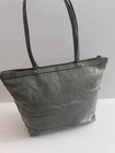 Crafted from gray signature patent leather, this Coach shoulder tote bag is a stylish and versatile accessory perfect for travel, casual outings, or business meetings. The rectangular shape features a zip closure and double handles with a 9" drop, making it easy to carry. The interior is lined with sateen and includes two open slip pockets and one zipper pocket, along with a Coach bag charm tag. This medium-sized bag exudes a classic and designer vibe, ideal for a city on-the-go look. Excellent condition