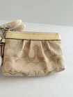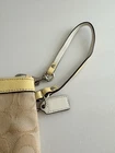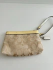 The COACH Signature C Logo Zip Wristlet is a stylish accessory for women, featuring canvas fabric with silver leather trim. This one-size card wallet showcases the iconic Signature C pattern and logo accent, making it a chic choice for everyday use. The wristlet design adds convenience and ease of carrying, while the metal theme adds a touch of sophistication to any outfit. Made in Vietnam, this Coach item is a fashionable and practical addition to any wardrobe. Excellent condition 7”Lx4”Hx1”D Cream color ✨ Shipping the Same Day 📦 Shipped with care 🔄 30-Day Free Returns (under not as described policy) 💖 Thank you for shopping at Karo’s