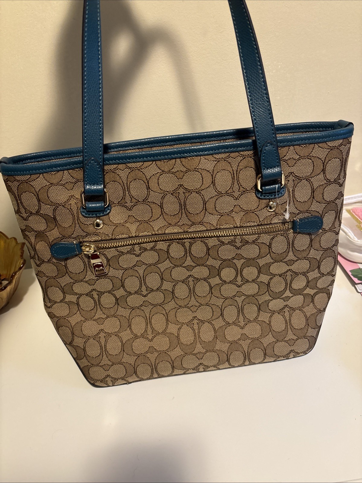 Love this Coach tote—perfect mix of khaki and blue! The leather handles and gold hardware give it a luxe feel, and it’s surprisingly roomy. Brand new with tags off, but still has the protective wrap on the zipper. Super stylish and practical for everyday use!