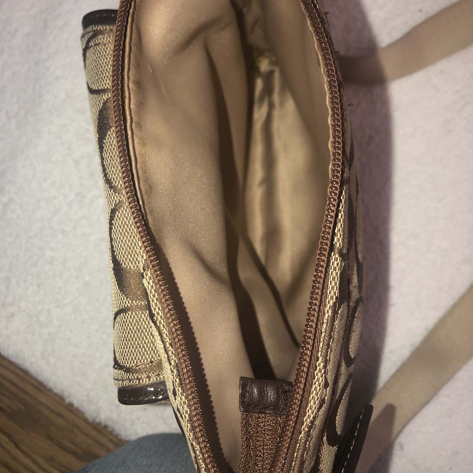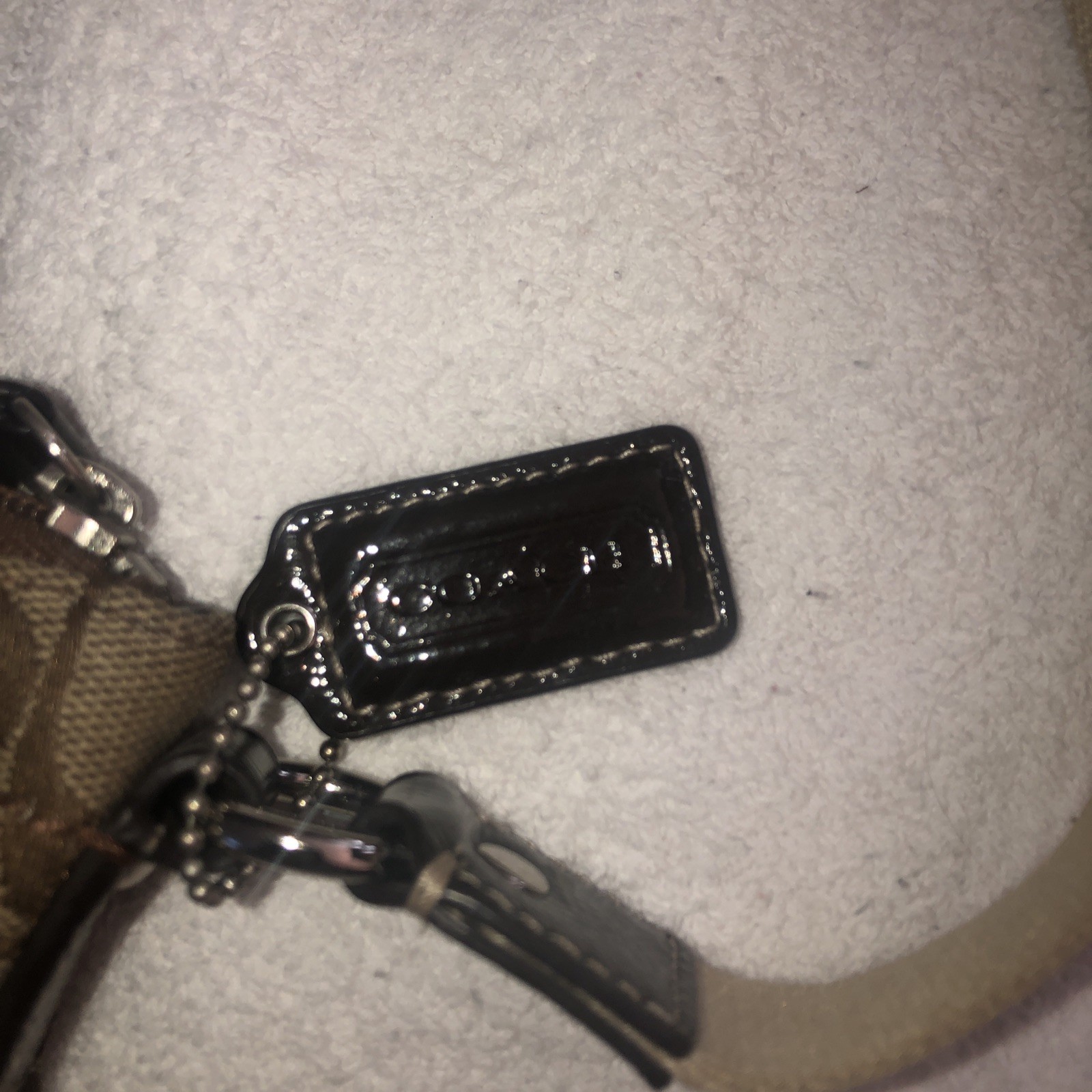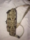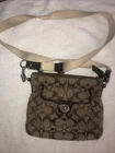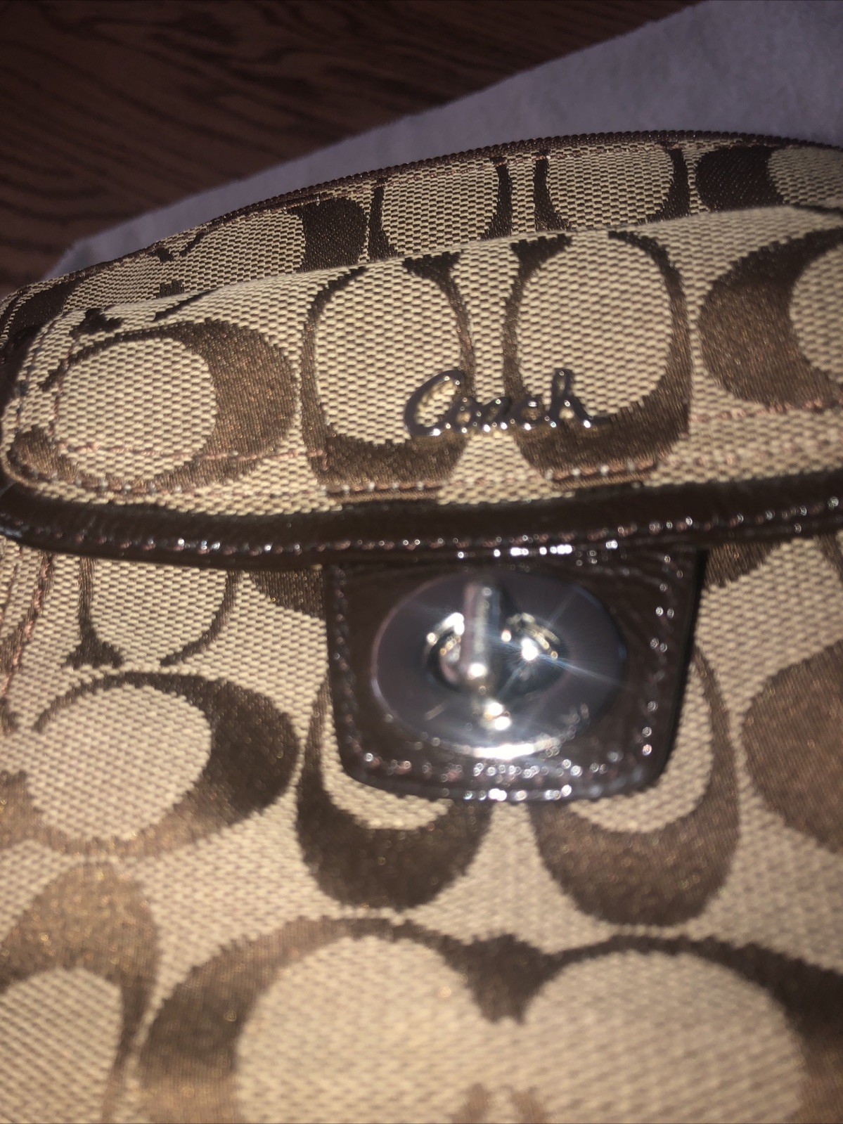 The COACH Signature Crossbody purse has a zip closure & twist lock pocket on front. Brown patent leather trim. Beige adjustable crossbody /shoulder strap. Purse is in pre owned good used condition. See pictures ! Approx.. 7 “ tall and 9” wide This is a nice purse!