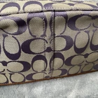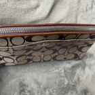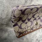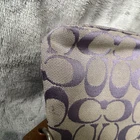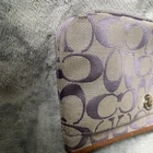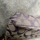 COACH Grey/Purple Signature Canvas Wristlet/Clutch with Pocket Light grey canvas with purple signature canvas exterior Brown trim, strap, hangtag and zipper pull Wristlet-type loop strap with bulldog clip Hangtag on beaded chain Zipper closure across top with pull tab Front pocket with Coach lozenge accent Interior is tan fabric with 1 slip pocket Approximate measurements: 9” x 4.5” In good, preowned condition. Some marks and wear but fully functional.