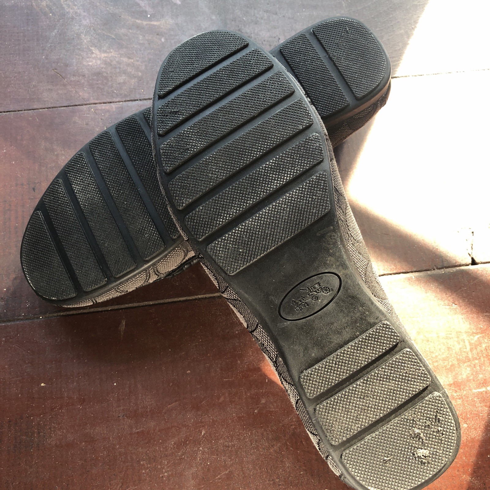 The COACH Signature Jacquard Leather Loafers Flats in Brown are a stylish and comfortable option for women looking for a vintage-inspired shoe. These slip-on loafers feature a round toe shape and a cushioned insole made of leather, providing a luxurious feel. The signature Coach logo adds a touch of sophistication to the classic brown color, making these flats a versatile and timeless addition to any wardrobe. Perfect for everyday wear or dressy occasions, these loafers are sure to become a staple in any fashion-forward woman's shoe collection. Excellent like new condition!