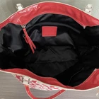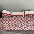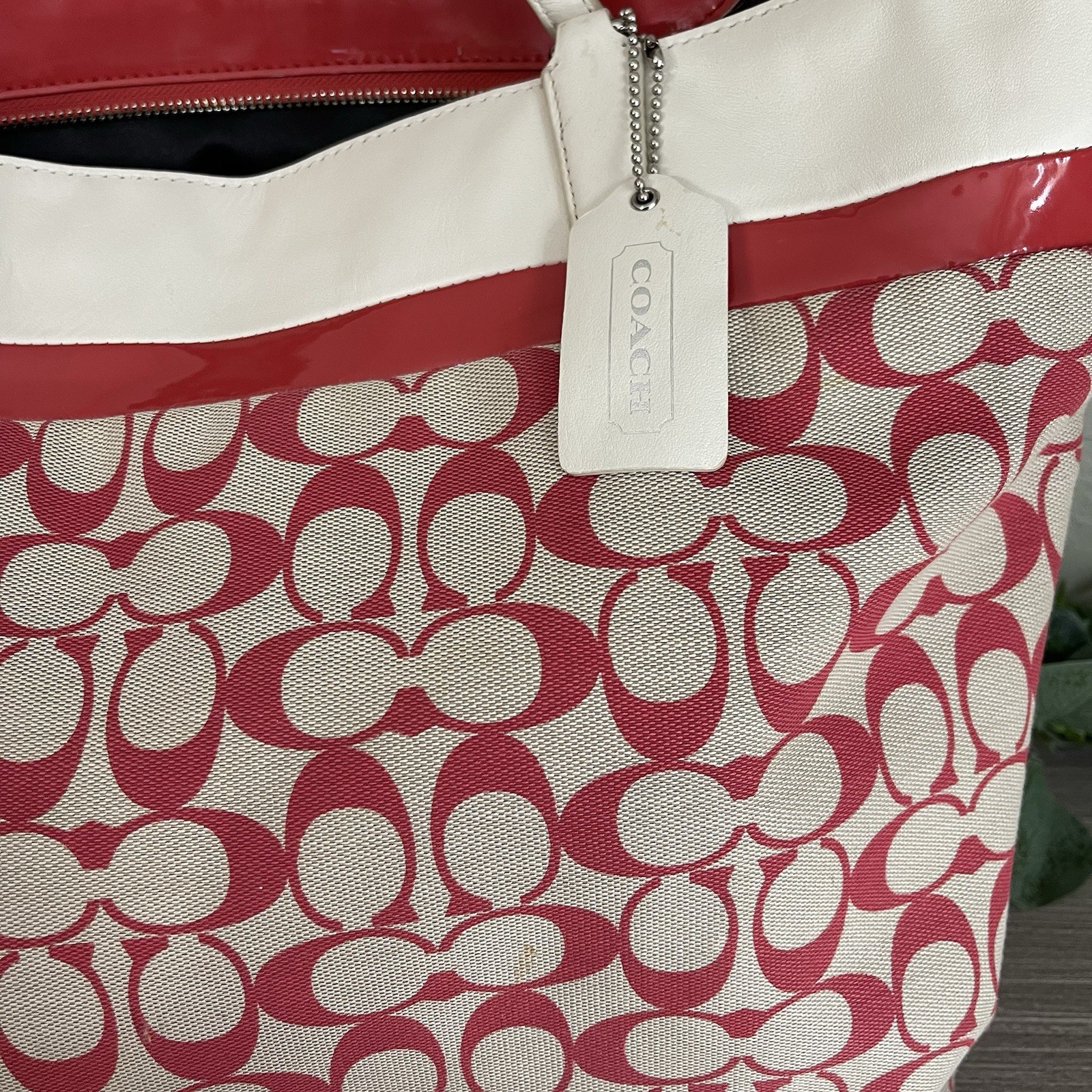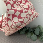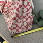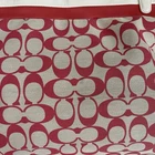 COACH Signature All Over Logo Print Light Khaki/ Red Large Tote Bag good pre owned condition with small flaws on exterior as shown in pictures. Interior very clean. Lots of life left Please see all photos for exact item condition and measurements.