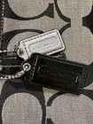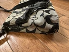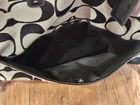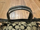 COACH Signature Stripe Foldover Tote Coach - Black/Silver Pre-owned in Excellent Condition. No marks or stains. No D1361-F23304 * Signature fabric with patent fabric trim * Inside zip, cell phone and multifunction pockets * Zip-top closure, fabric lining * Handles with 4 3/4" drop * Adjustable strap for shoulder or crossbody wear * 14 3/4" (L) x 15 1/4" (H) x 3" (W)