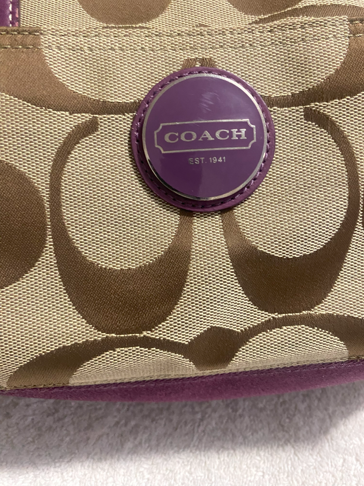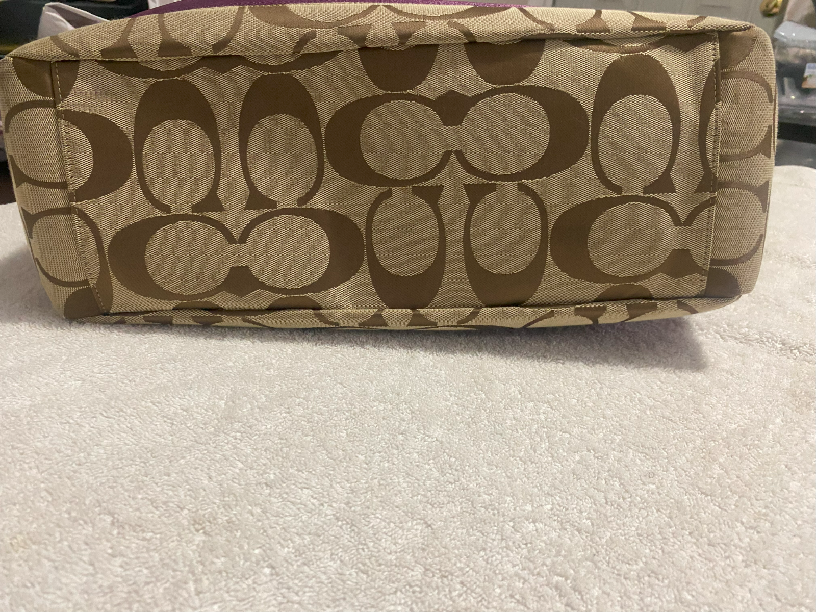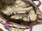 The Coach Plum/Khaki Signature Stripe Zip Tote Bag is a stylish and practical handbag purse featuring a zip closure and a medium size with a bag height of 10 inches, depth of 4 inches, and length of 14 inches. Made of jacquard exterior material, this tote bag from Coach's Outlet product line showcases a signature striped pattern in plum and khaki colors, along with strap accents and a zipper pull accent. The bag has a convenient strap drop of 9 inches, making it easy to carry on the shoulder or as a crossbody. Ideal for everyday use, this Coach tote bag is a versatile and fashionable accessory for any woman's wardrobe.